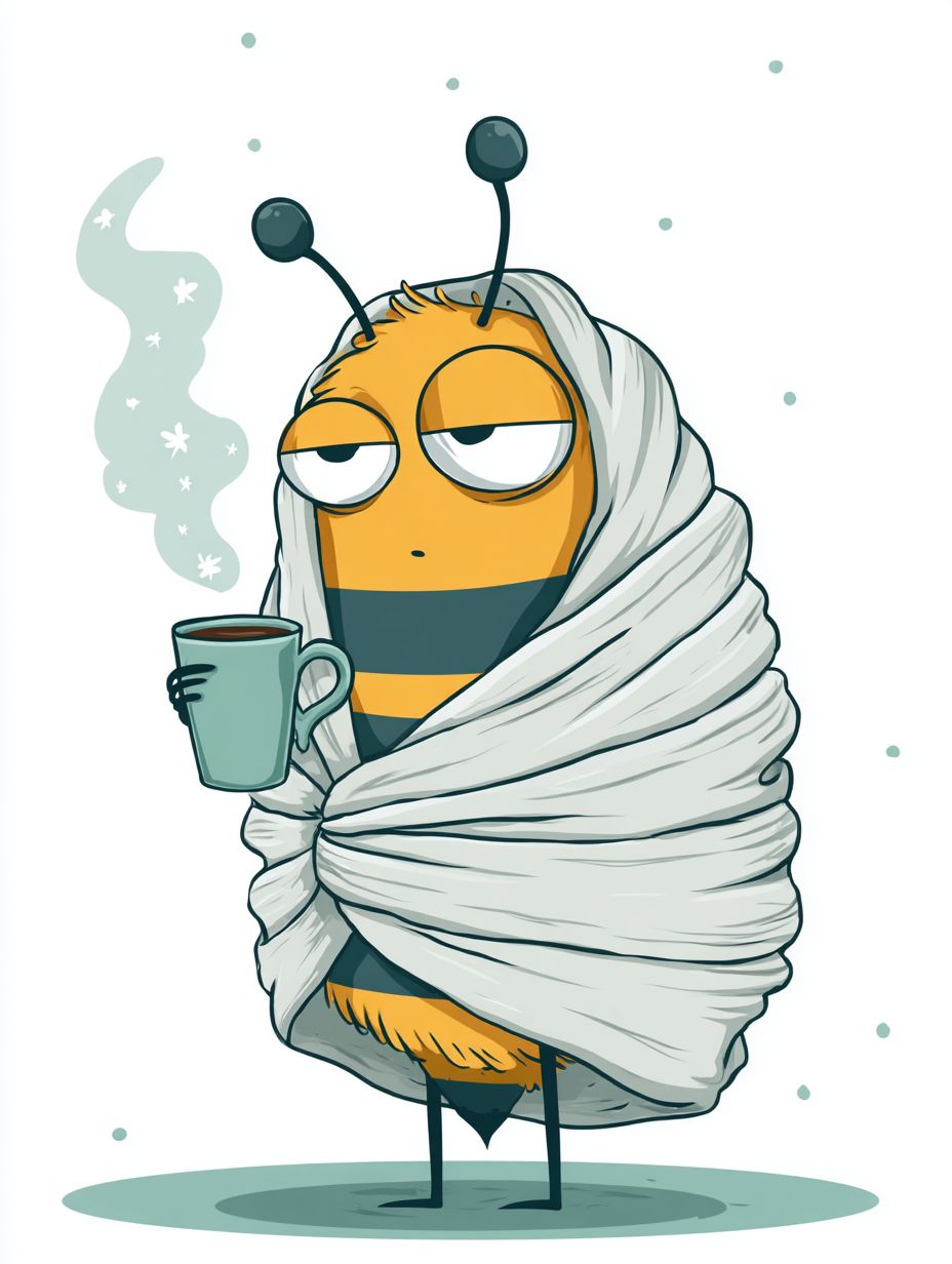 Eine Cartoon-Biene, in eine Decke gewickelt, schläfrig Kaffee trinkend