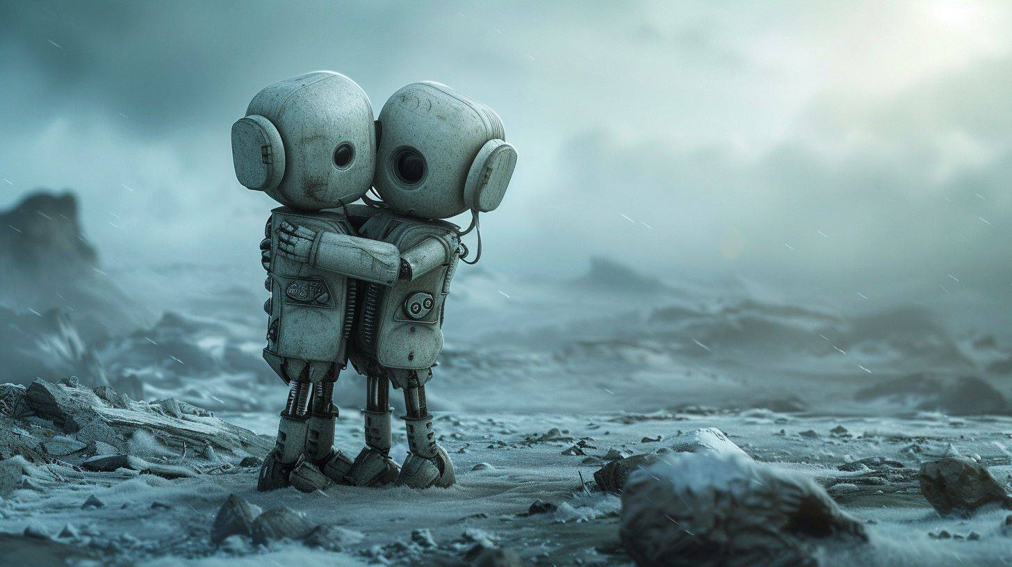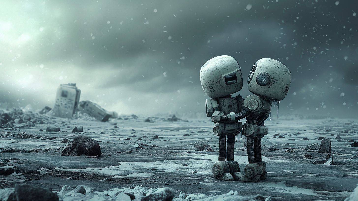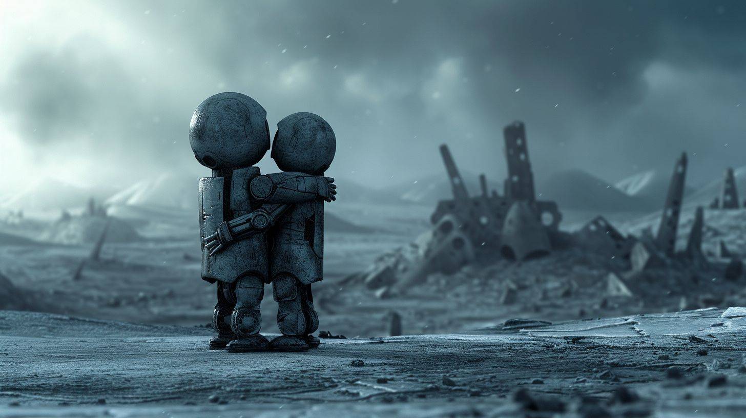 In einer kalten, verlassenen Welt in Ruinen umarmen sich zwei kleine Roboter und zeigen einen beeindruckenden und außergewöhnlichen Kunststil.