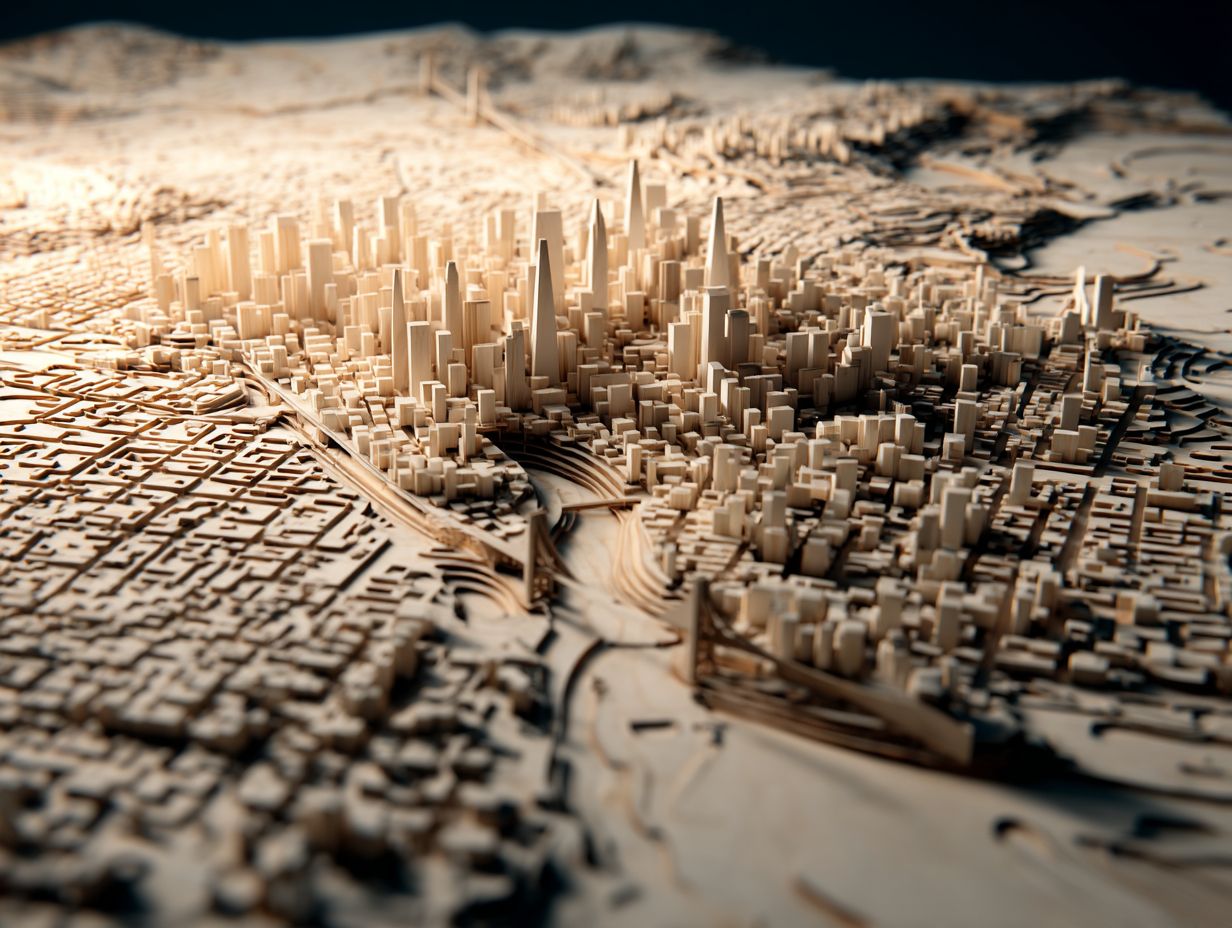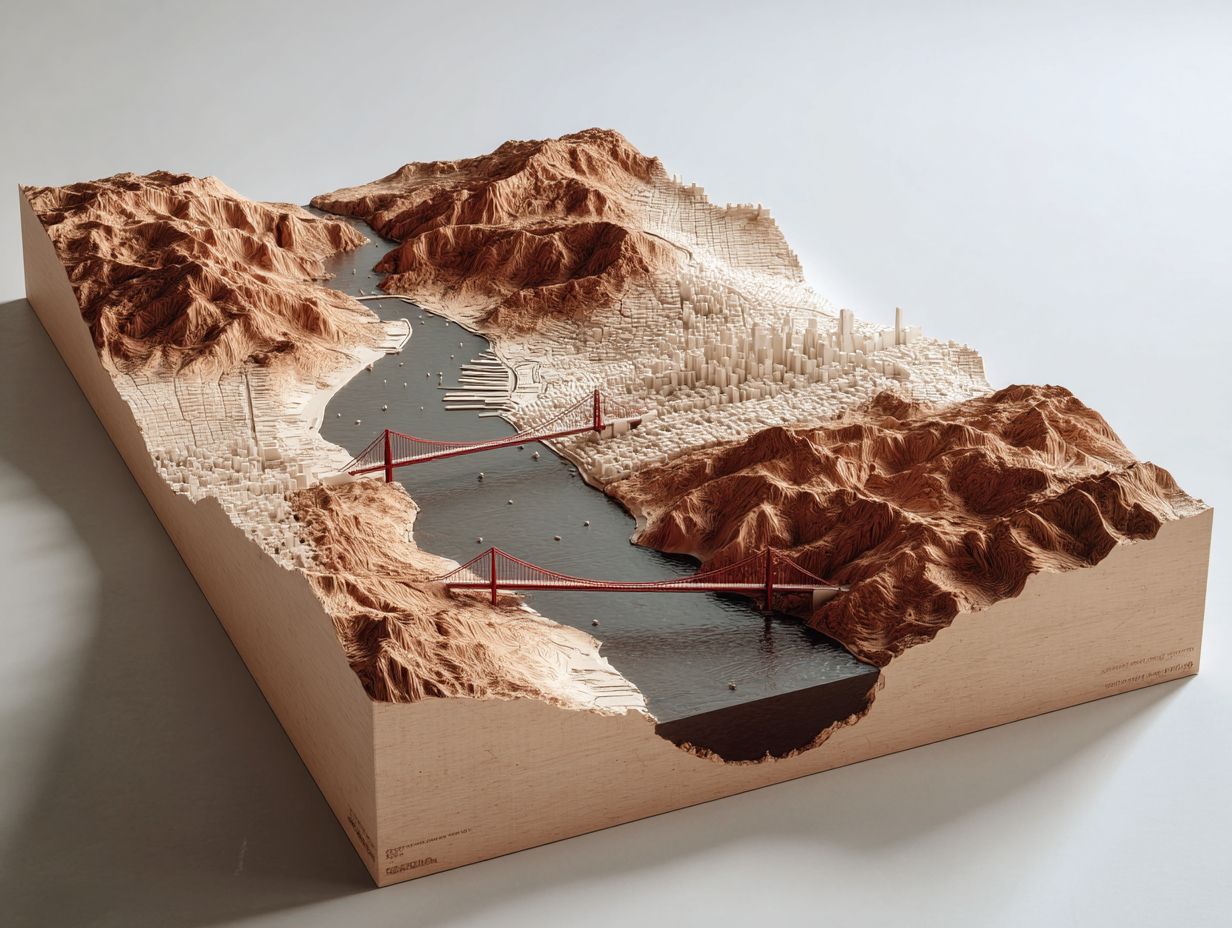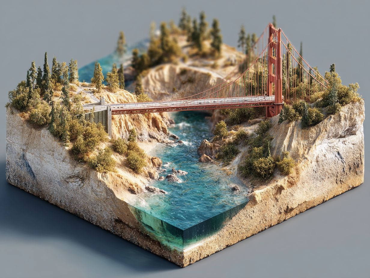3D model scenery, an endless San Francisco landscape with the golden gate bridge at the sunset, terrain, cut-out diagram --c 12 --ar 4:3 --v 7.0