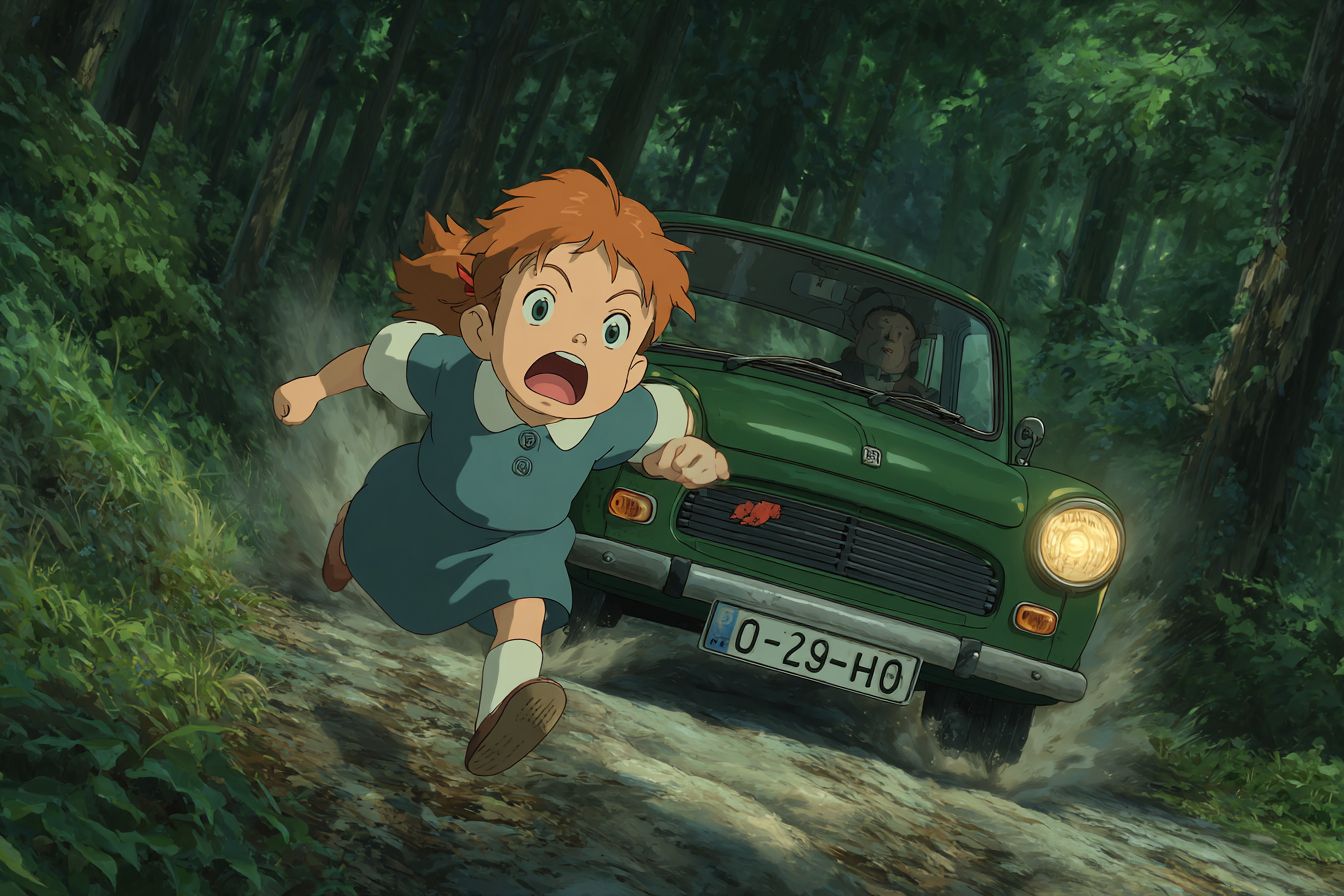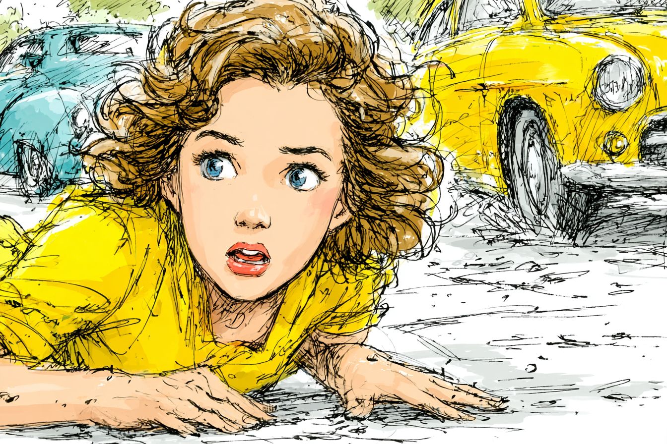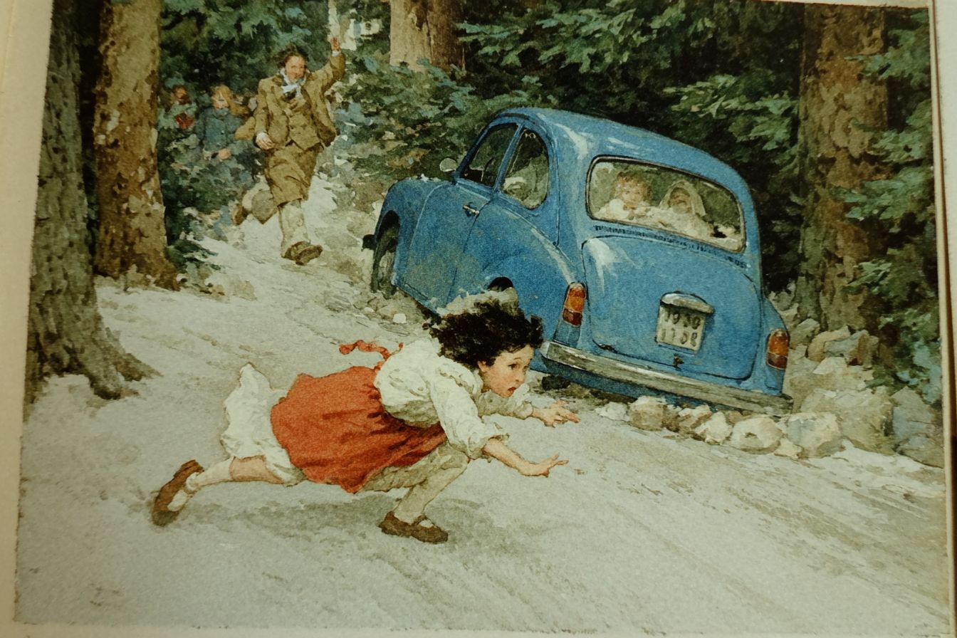 draw an episode from the book pollyanna before the accident, in which the girl is knocked down by the car the girl runs out in front of the car on the forest road --chaos 50 --ar 3:2 --raw --stylize 550 --v 7.0