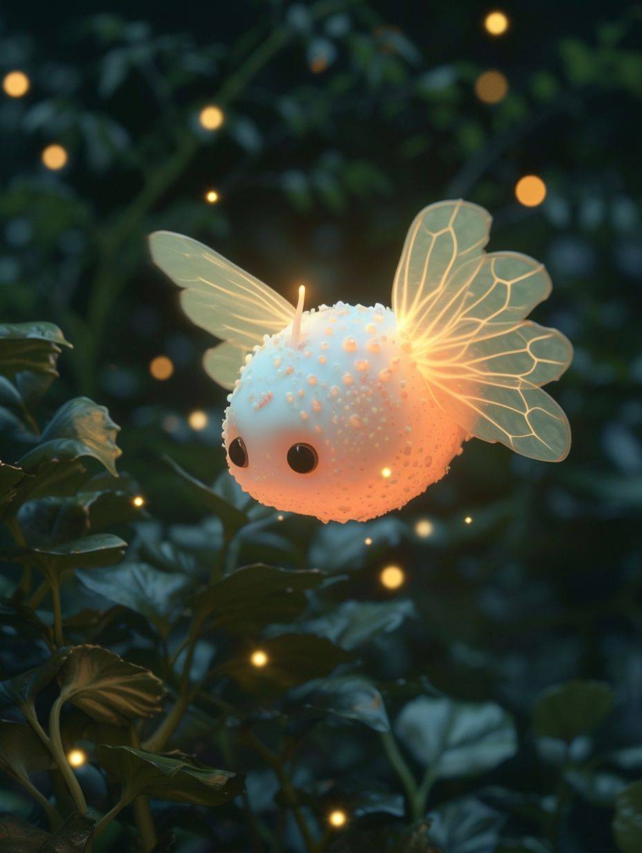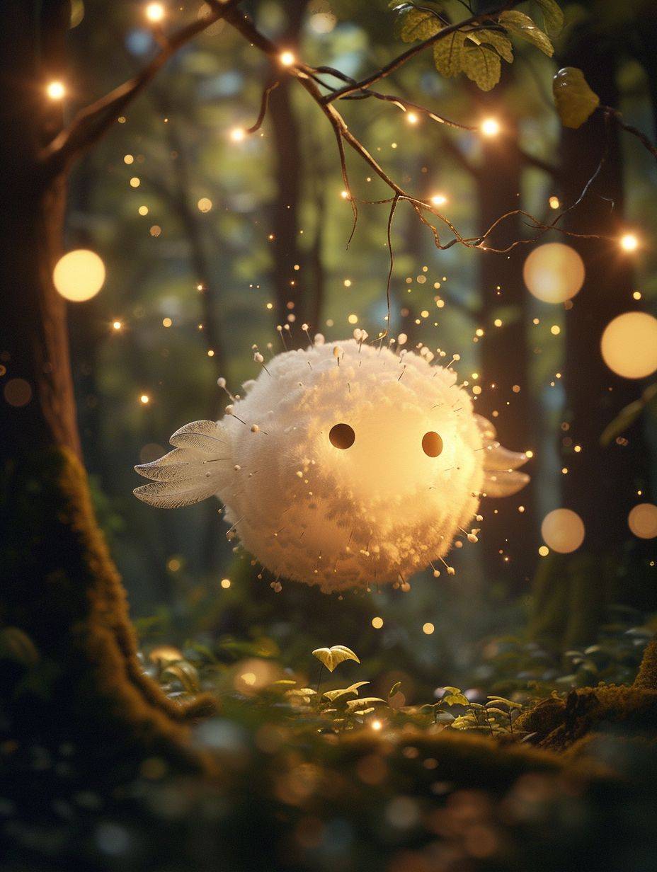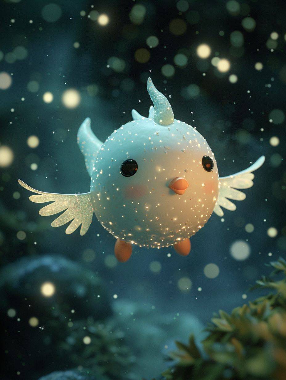 cute floating puffball with luminescent spots and tiny wings, 3d print illustration, smooth animation, twinkling starlit scenery --ar 3:4 --v 6