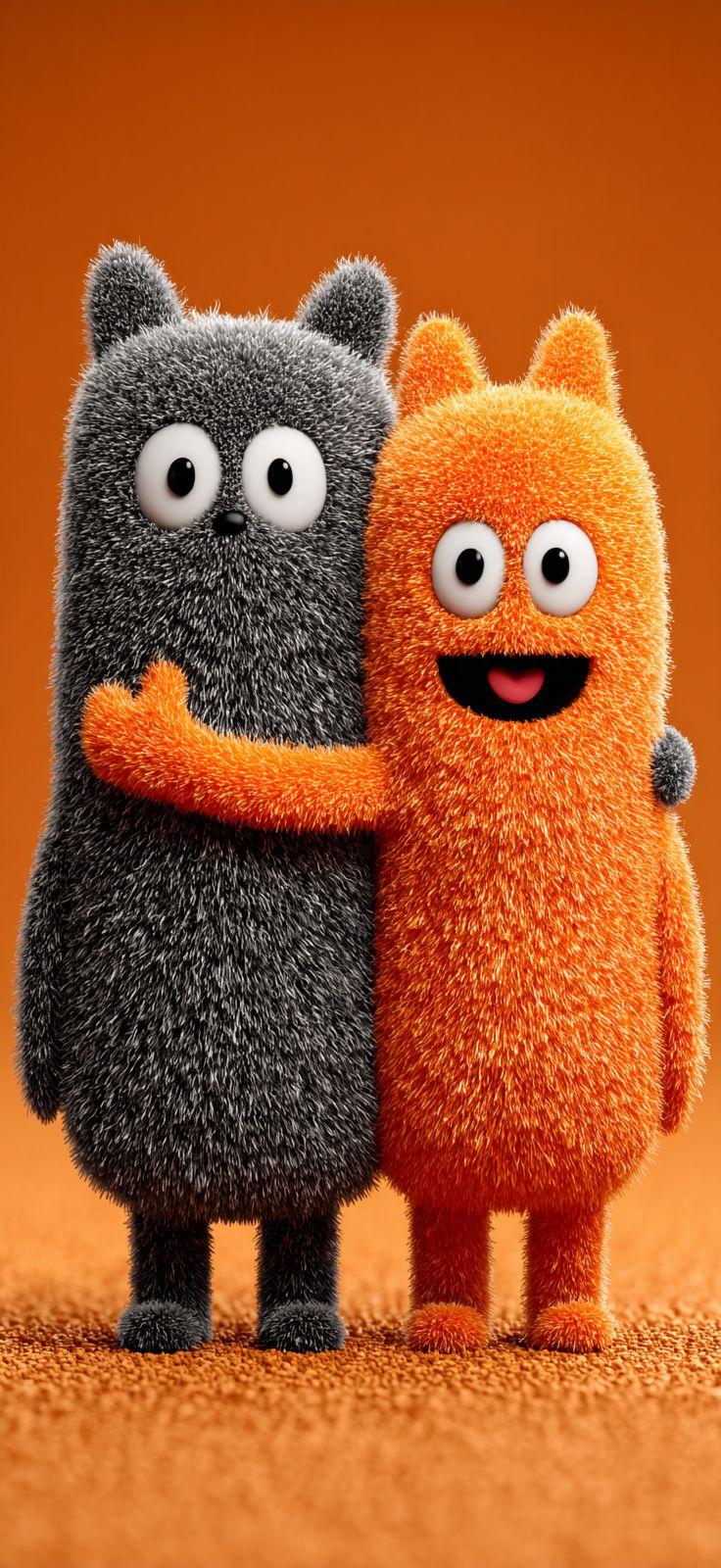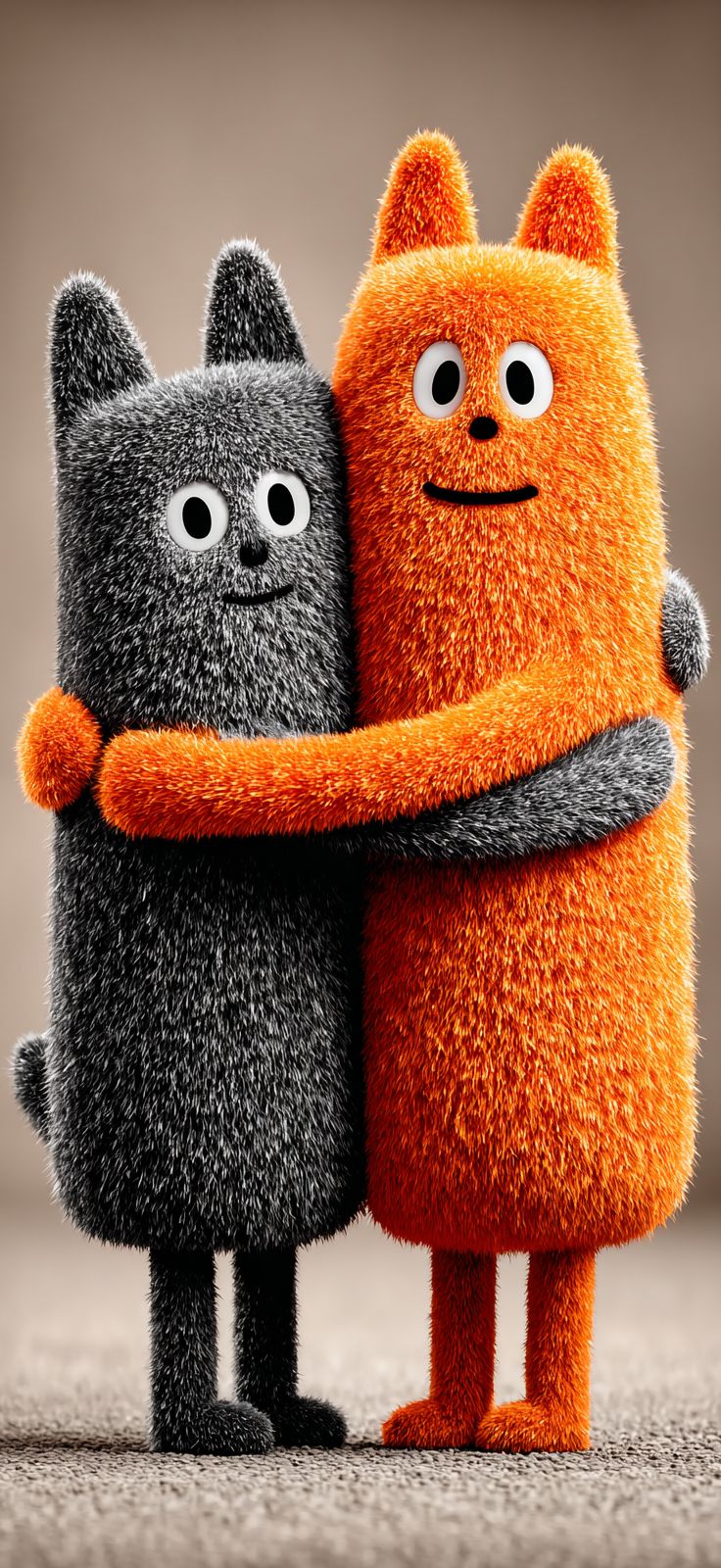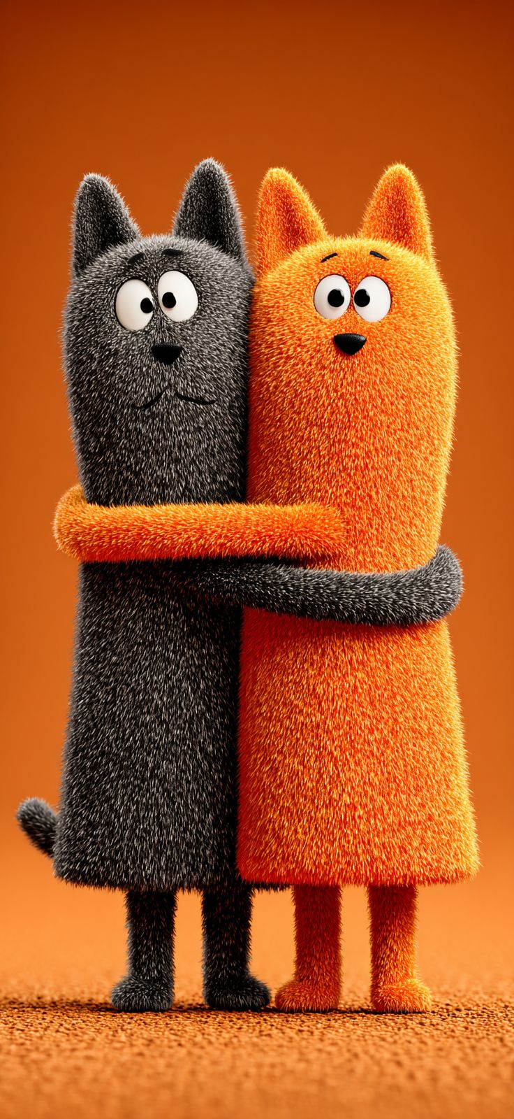 two cute cartoon cats, one gray cat and the other orange cat hugging each others back , fluffy fur, cute and cuddly look, Pixar style, simple background, wallpaper design, high definition wallpaper, 3D rendering, full body shot, side view, cute and funny pose, simple solid color background, 2d game art, cute cartoon design, cute and colorful design, detailed character design, simple design, solid color background, minimalist background, 45 degree angle of view --ar 59:128 --v 7.0 --s 750