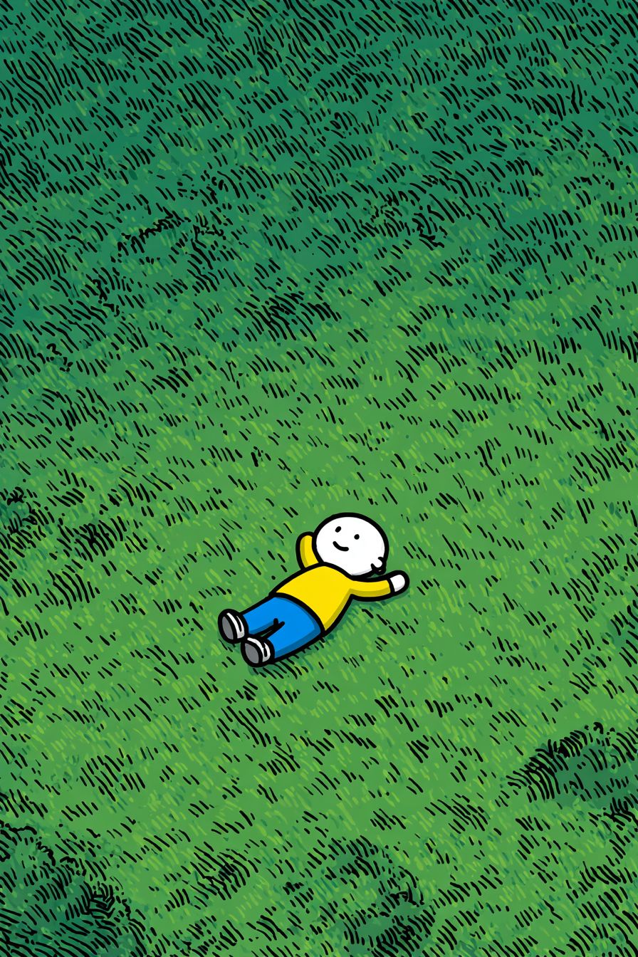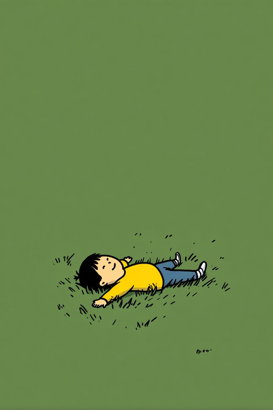Im Stil des Künstlers Yeoniu Choi, eine einfache Strichzeichnung, cartoonhaft, mit kräftigen Umrissen, die an den neuesten minimalistischen Stil von Herrn Van Gogh erinnern. Die Szene zeigt eine einfache Comic-Illustration mit einem völlig grünen Gras Hintergrund. Ein kleiner Junge liegt auf dem Rücken mit in die Luft gehobenen Beinen, trägt ein gelbes Oberteil und blaue Hosen und hat ein zufriedenes Lächeln auf seinem Gesicht.