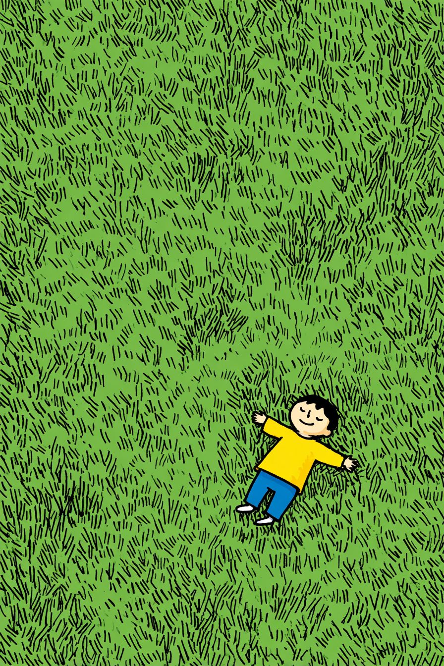 In the style of artist Yeoniu Choi, a simple line drawing, cartoonish, with bold outlines reminiscent of Mr. Van Gogh's latest minimalist style. The scene features a simple comic illustration with an all-green grass background. A small boy is lying on his back with his legs in the air, wearing a yellow top and blue pants, and he has a content smile on his face. --v 7.0 --ar 2:3