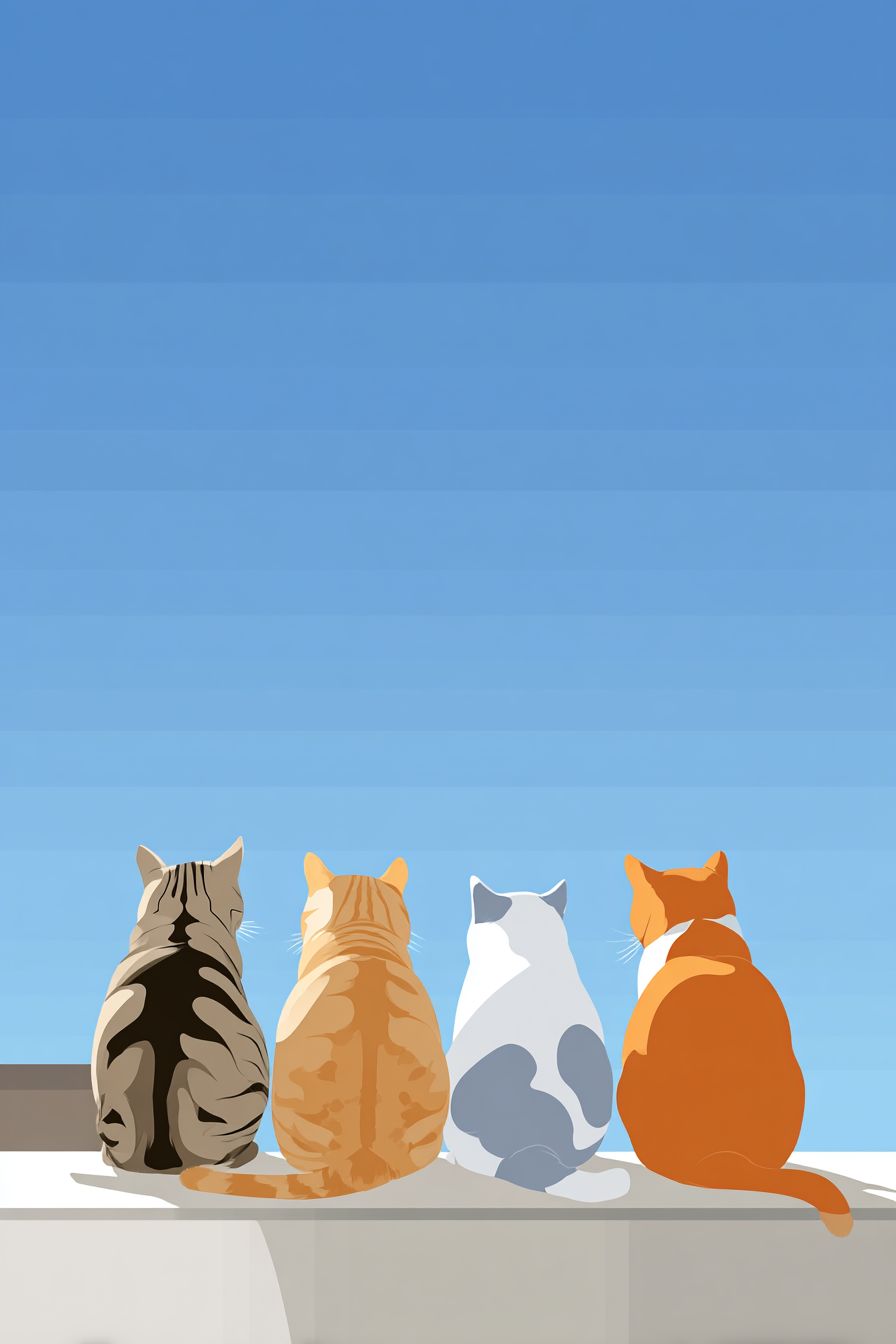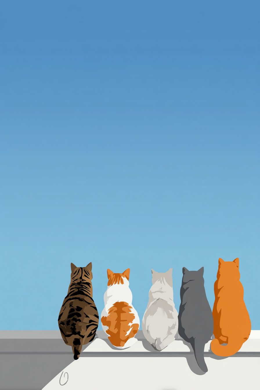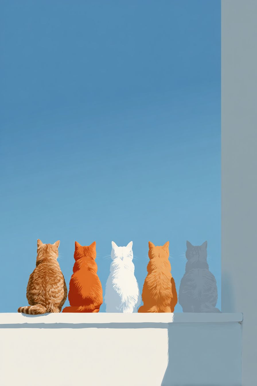minimalist illustration of five cats sitting on a white wall, viewed from behind, perfectly aligned, each cat with distinct colors: tabby, orange-white, white, grey, and orange, clean soft gradient blue sky background, simple flat color blocks, no fur texture, smooth shapes, no outlines, elegant negative space composition, calm and peaceful atmosphere --ar 2:3 --v 7.0