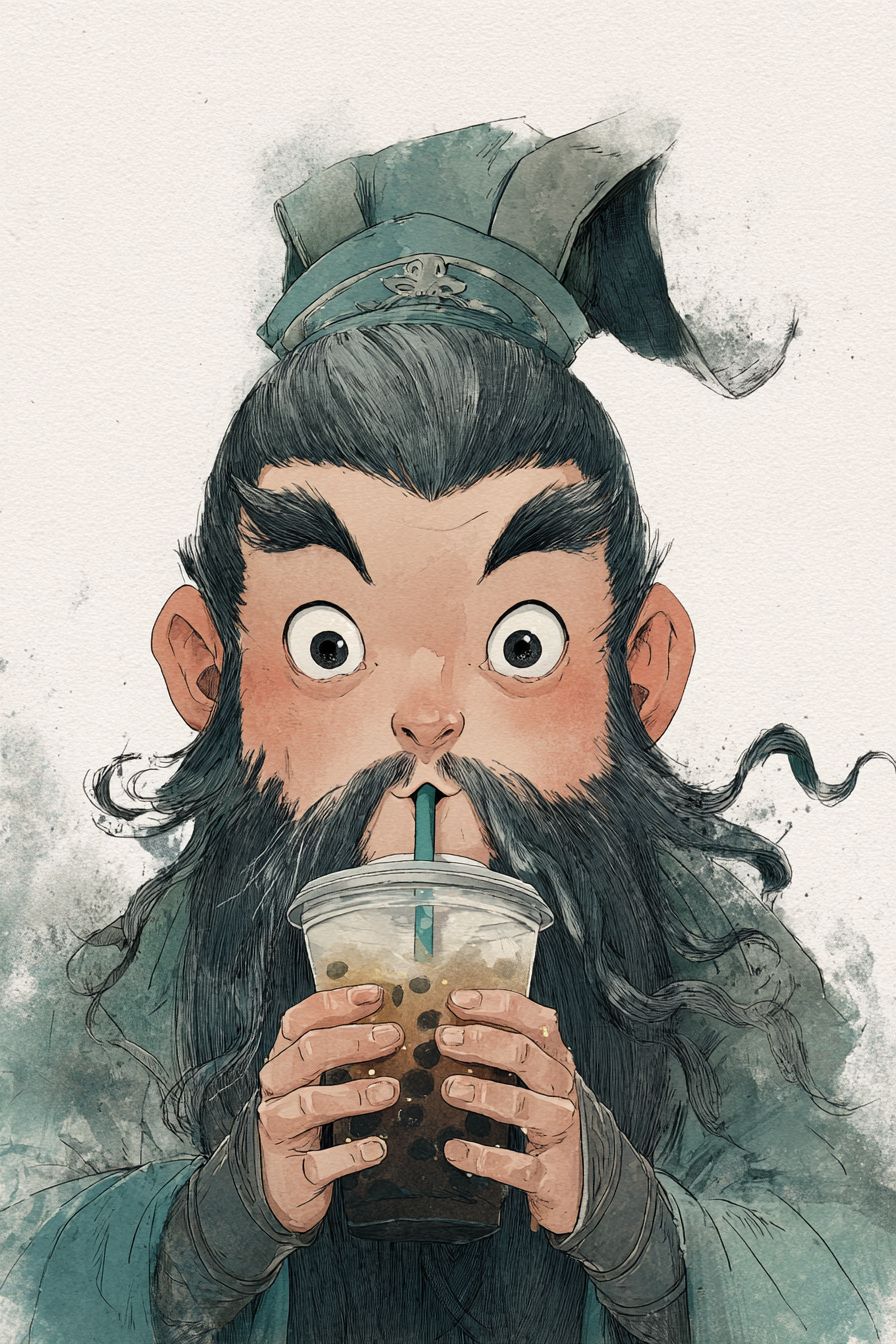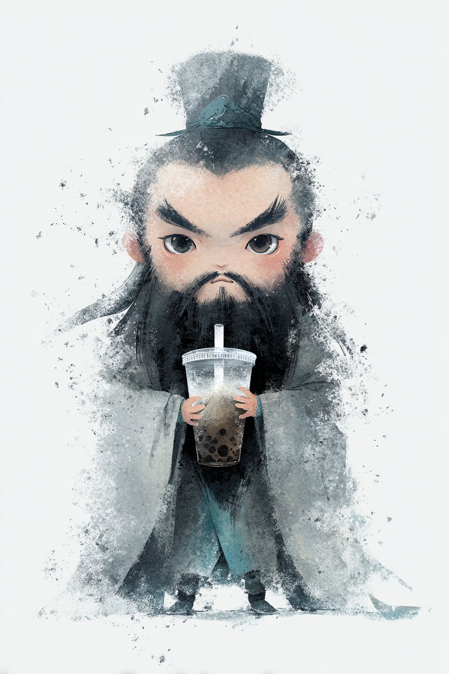 Avatar illustration, artistic illustration, fluffy imagery, Guan Yu, wide-open eyes, holding a large cup of cold drink with a straw in both hands, minimalist style, blurred forms, white background, close-up, chibi style, oversized head, exuding a clear and detailed depiction reminiscent of ink wash painting, high aesthetic appeal, graphic, blurred, minimalist, negative space, artistic conception, high-end, masterpiece, minimalist. --ar 2:3 --v 7.0