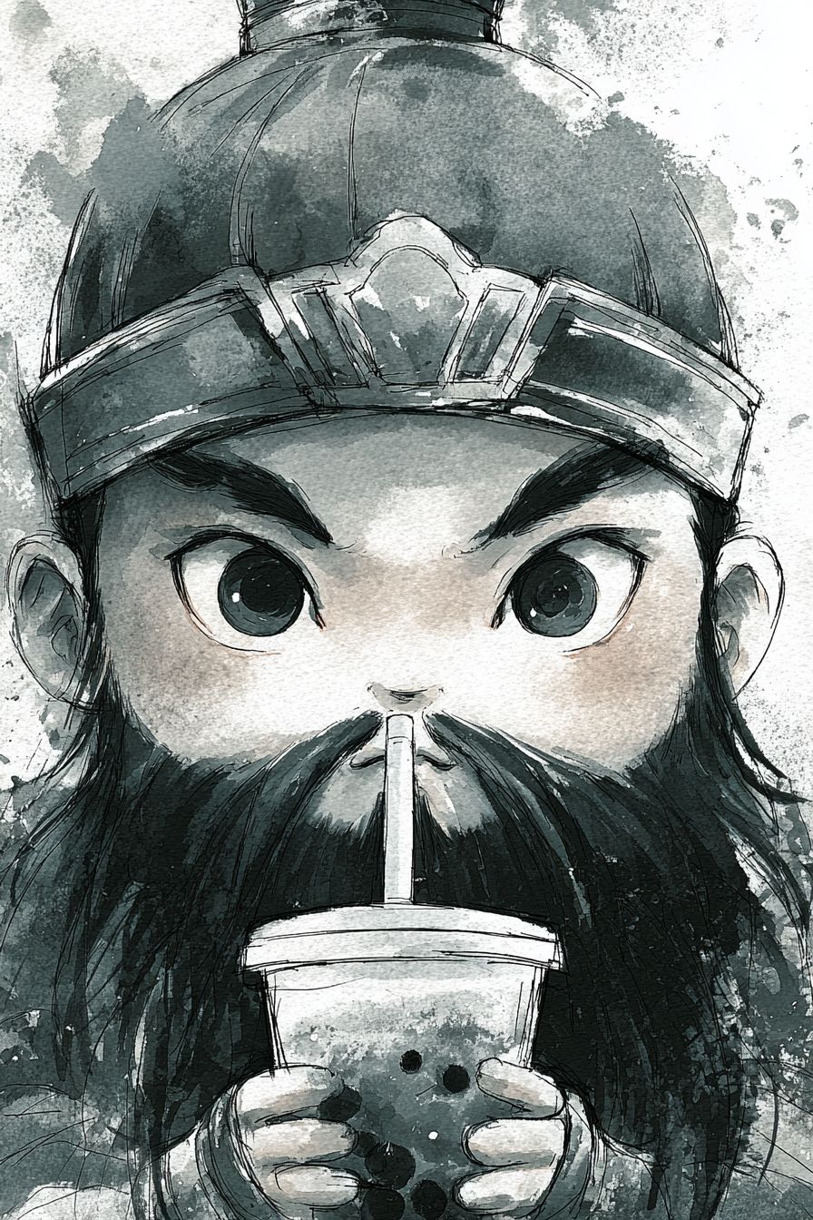 Illustration von Guan Yu mit einem großen kalten Getränk