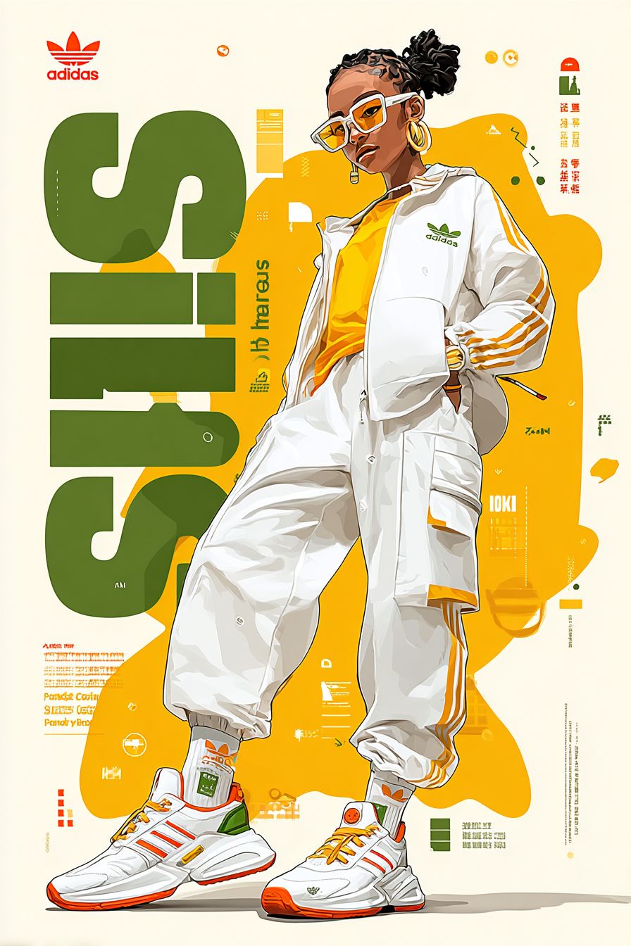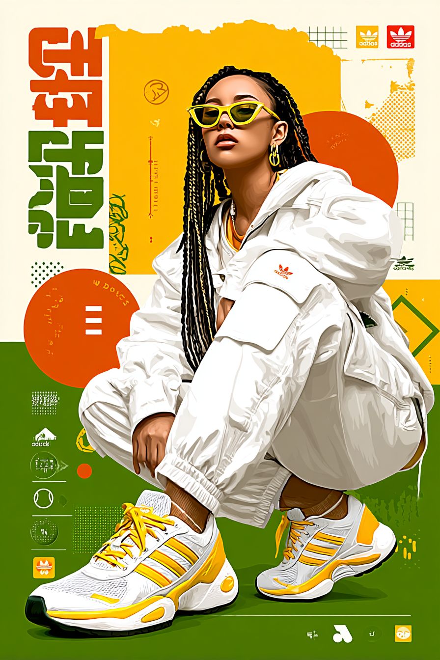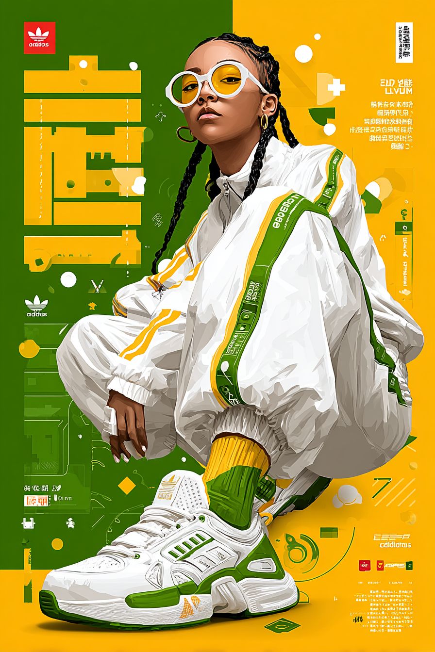 Sportliche Mode-Collage-Poster mit zerissener Papierästhetik, das eine junge schwarze Frau in einem weißen Adidas-Trainingsanzug und Sonnenbrille in einer selbstbewussten Pose zeigt, umgeben von dekonstruierter Adidas-Sneakers und Kleidungsstücken, mutiges grünes und weißes Farbschema mit gelben Akzenten, gemischte Typografie mit großem stilisierten Text-Overlay, vom Straßenkunst inspiriertes Design mit geometrischen Formen und verstreuten Markenlogos, moderner urbaner Modefotografie-Stil, hohe Kontrastbeleuchtung, Papiertexturüberlagerungen, zeitgenössische Sportbekleidung-Werbung-Ästhetik, dynamische Komposition mit geschichteten Elementen.