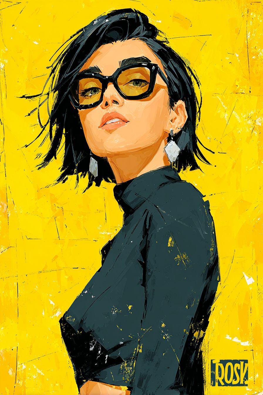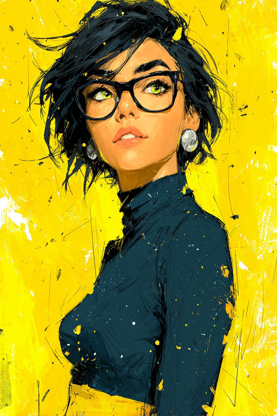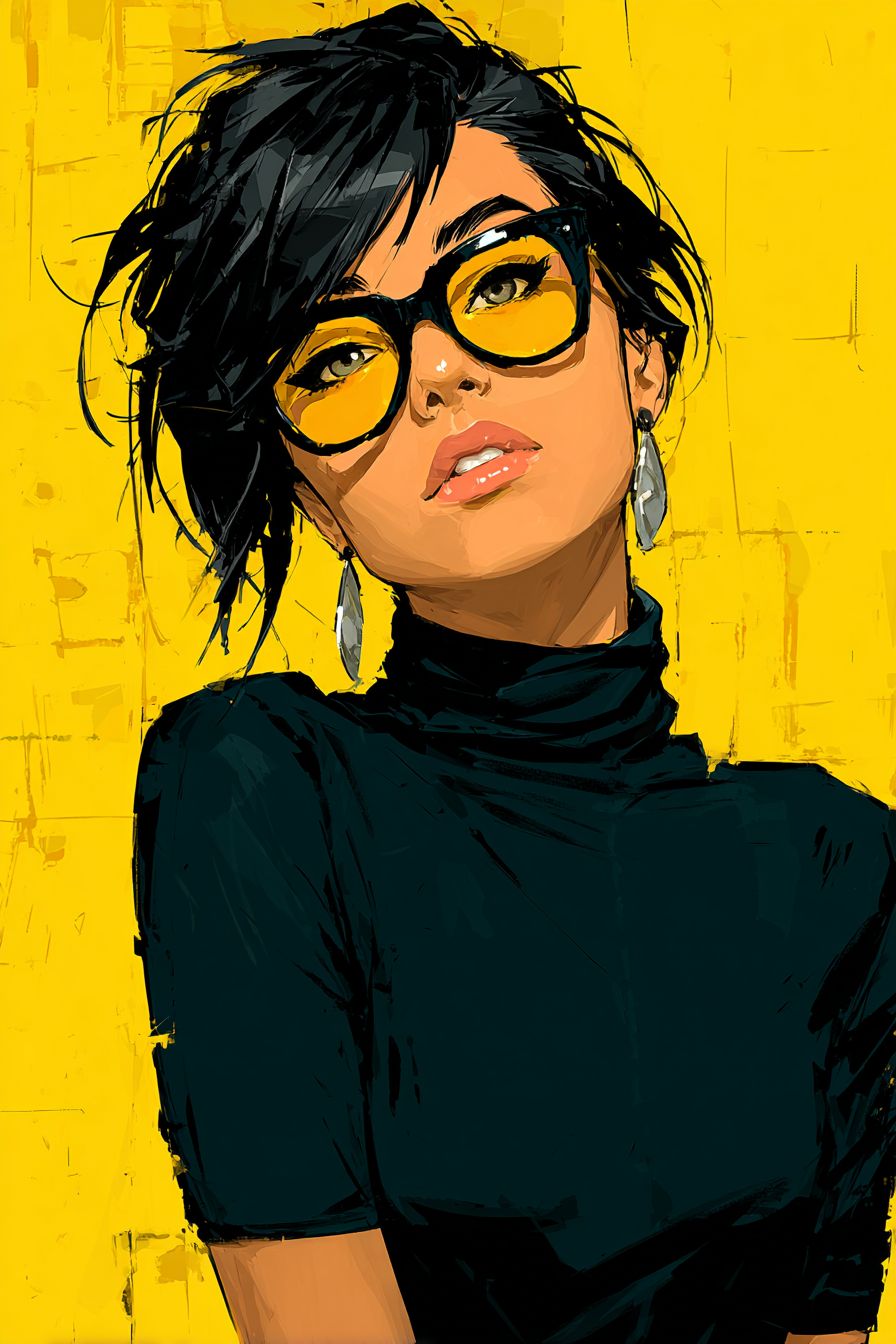 Moderne Illustration eines Halbporträts, Anime-Illustrationskunst, die eine kurzhaarige Frau mit schwarzen, dicken Brillengestellen zeigt. Sie trägt einen schwarzen Rollkragenpullover, ergänzt durch silberne Ohrringe, was eine kühle Farbkombination erzeugt. Der leuchtend gelbe Hintergrund bietet einen starken Kontrast. Zarte Pinselstriche beschreiben die Textur ihrer glatten Haut, während eine Nahaufnahme ihres Gesichts ihren selbstbewussten Blick hervorhebt und ein Gefühl von Wirkung und dynamischen Linien schafft. Der Charakter scheint aus dem Anime-Rahmen zu platzen und zeigt einen avantgardistischen Stil, der Pop-Art mit Elementen der Street Culture verbindet.