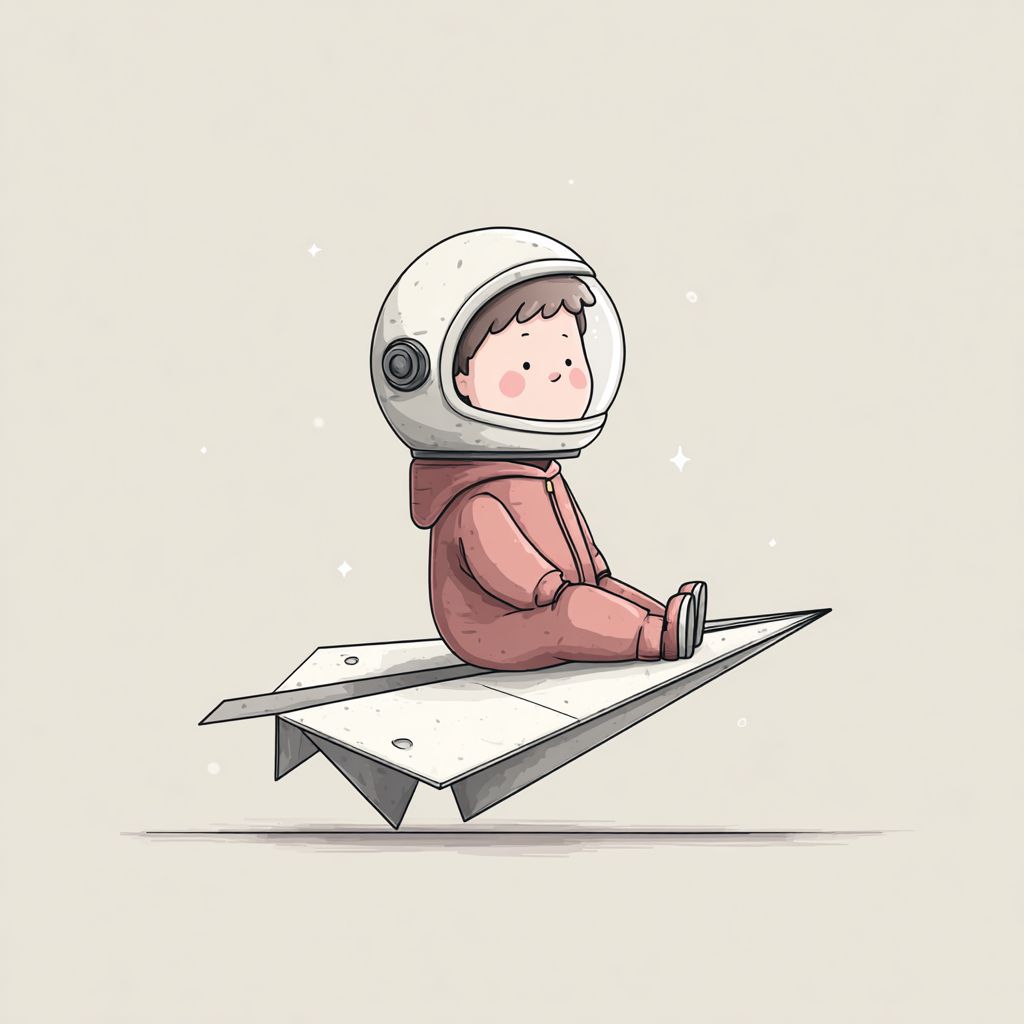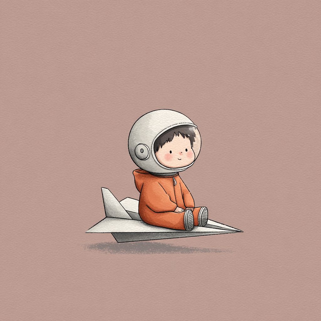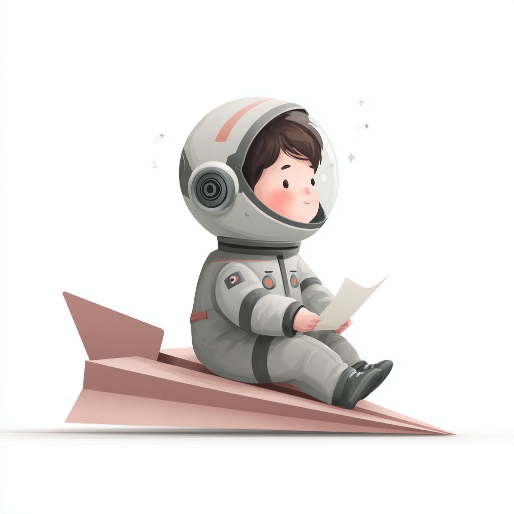 A little Chinese boy sitting on a paper airplane flying in the air, wearing an astronaut helmet, moving forward, white background, simple vector illustration style, pink color, soft, --stylize 250