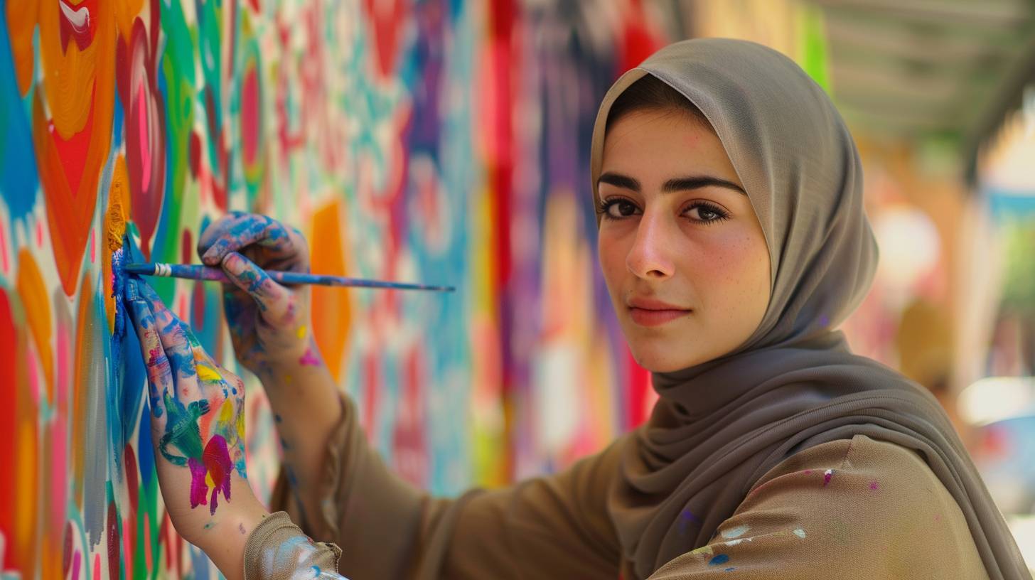Young woman in a hijab, painting a mural. Warm brown eyes. Colorful smears on her hands. Middle Eastern city. Afternoon. Bustling market, ancient architecture. Wide shot, full body. Bright lighting, vibrant colors of the mural standing out. High saturation. --ar 16:9 --v 6.0