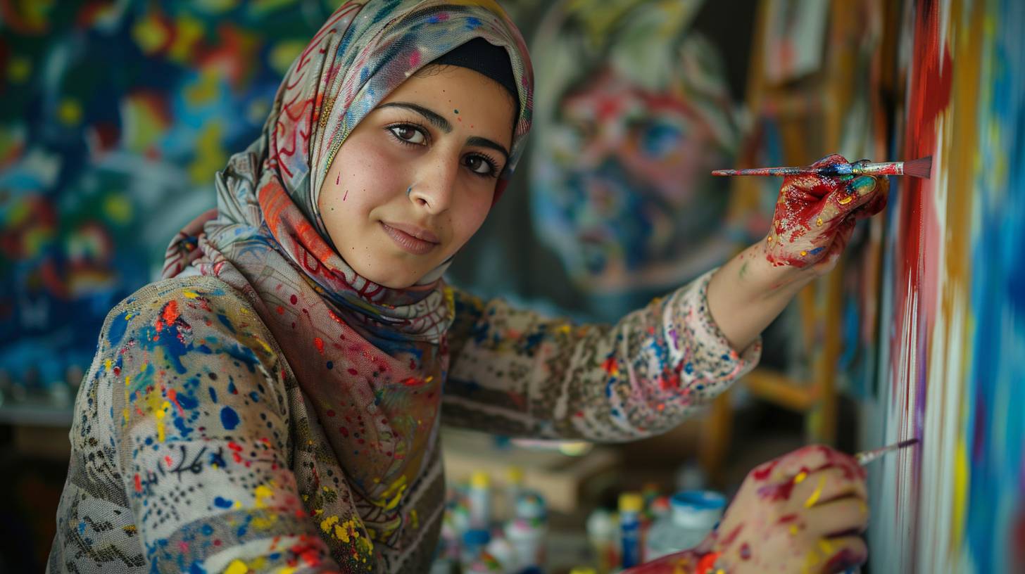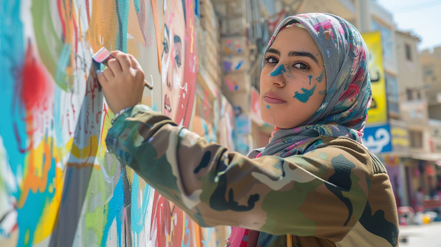 Eine junge Frau mit Kopftuch malt ein Wandgemälde, mit bunten Farben an ihren Händen, in einem geschäftigen Markt einer Stadt im Nahen Osten am Nachmittag, mit antiker Architektur im Hintergrund.