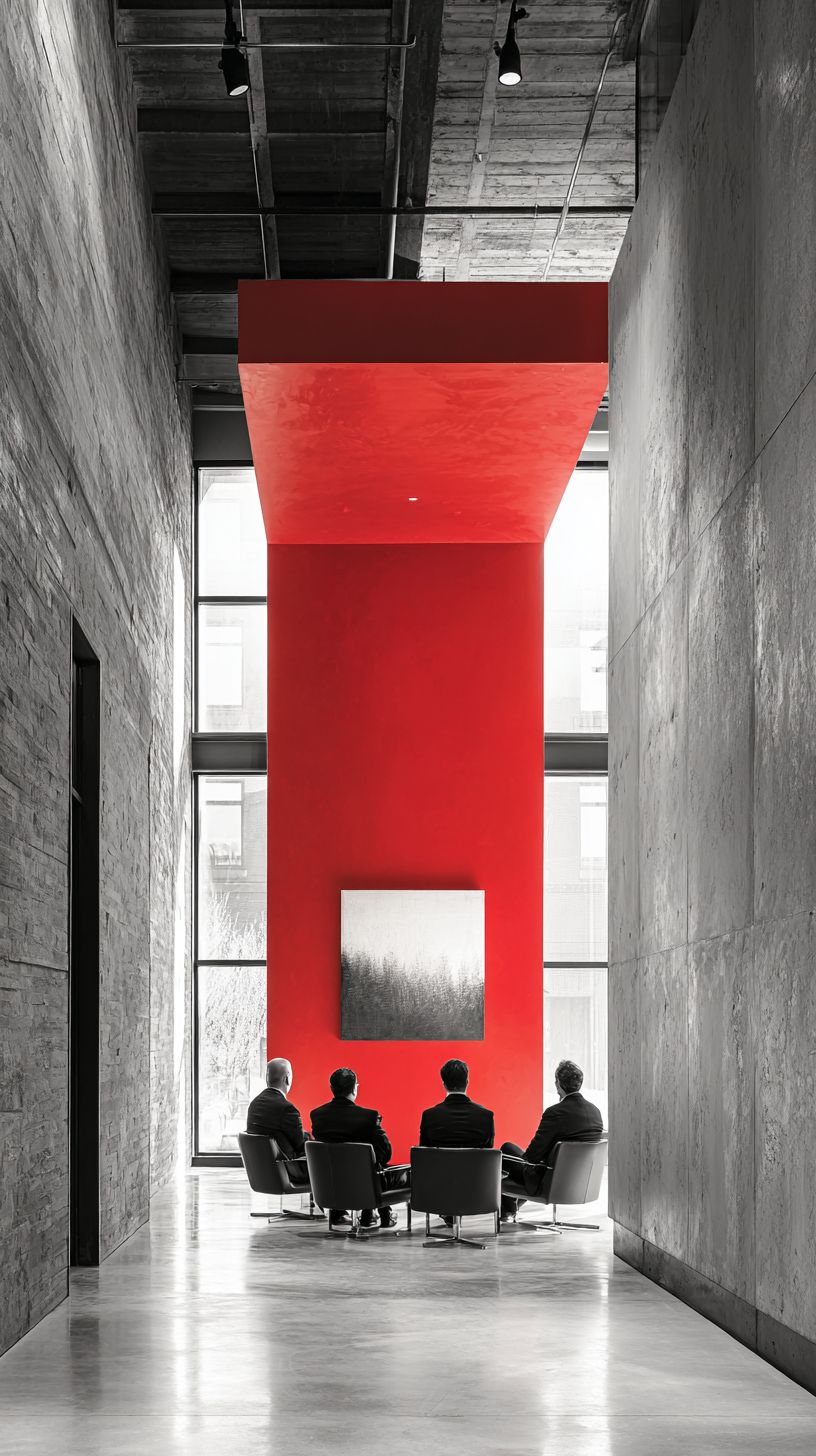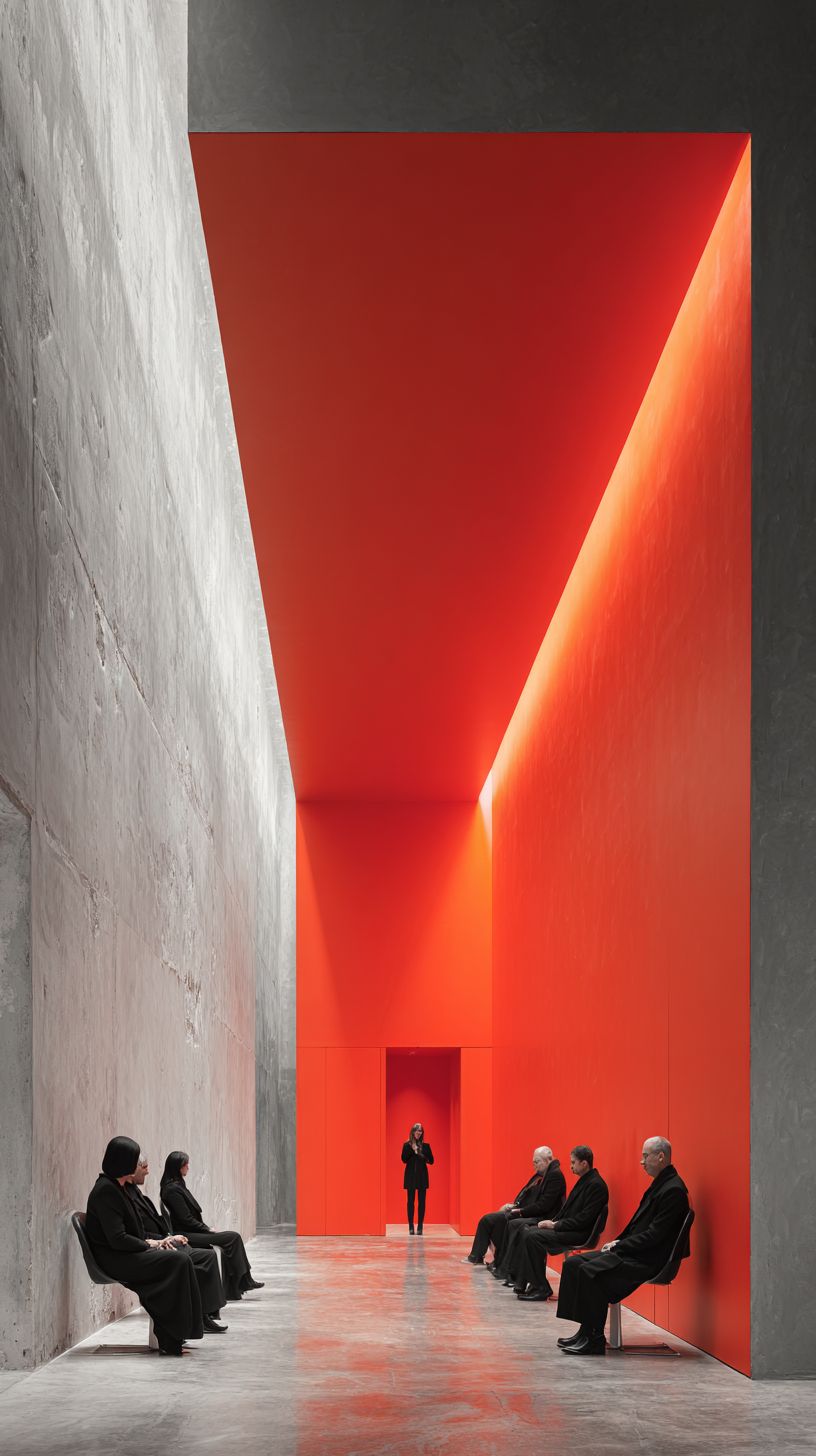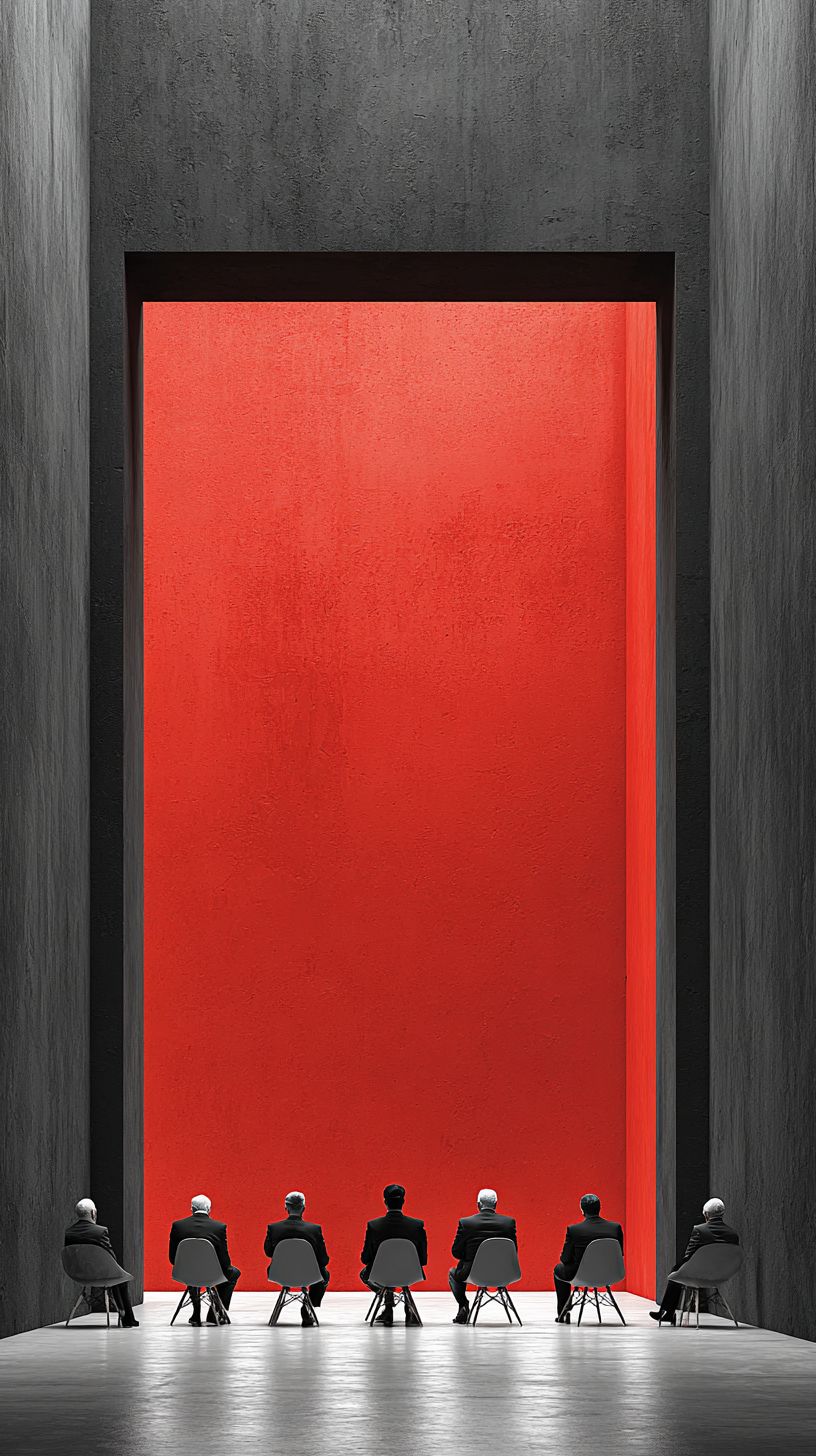 Modern minimalist psychology laboratory 1951, 8 people seated in chairs facing forward, contemporary black clothing, red accent wall behind, clean geometric composition. Color palette: red, black, white, gray concrete. High contrast, minimalist aesthetic, professional interior photography --ar 9:16 --raw --stylize 300