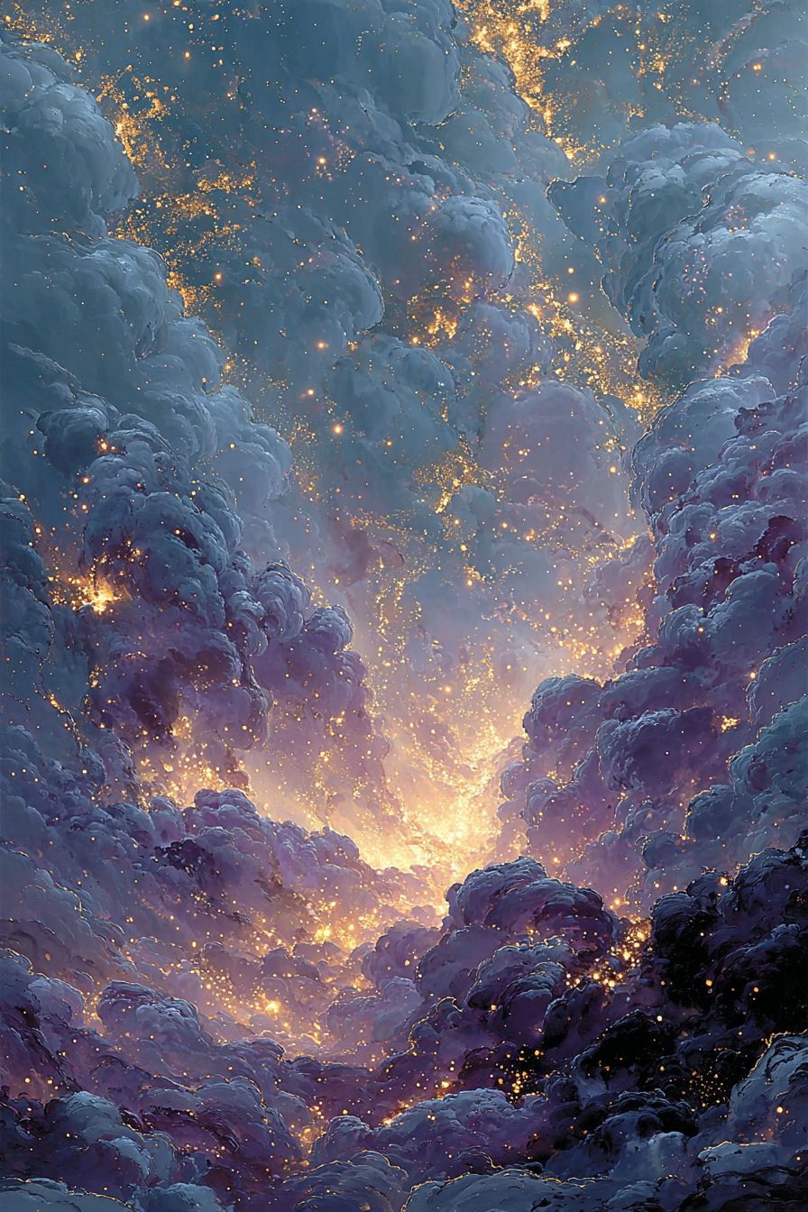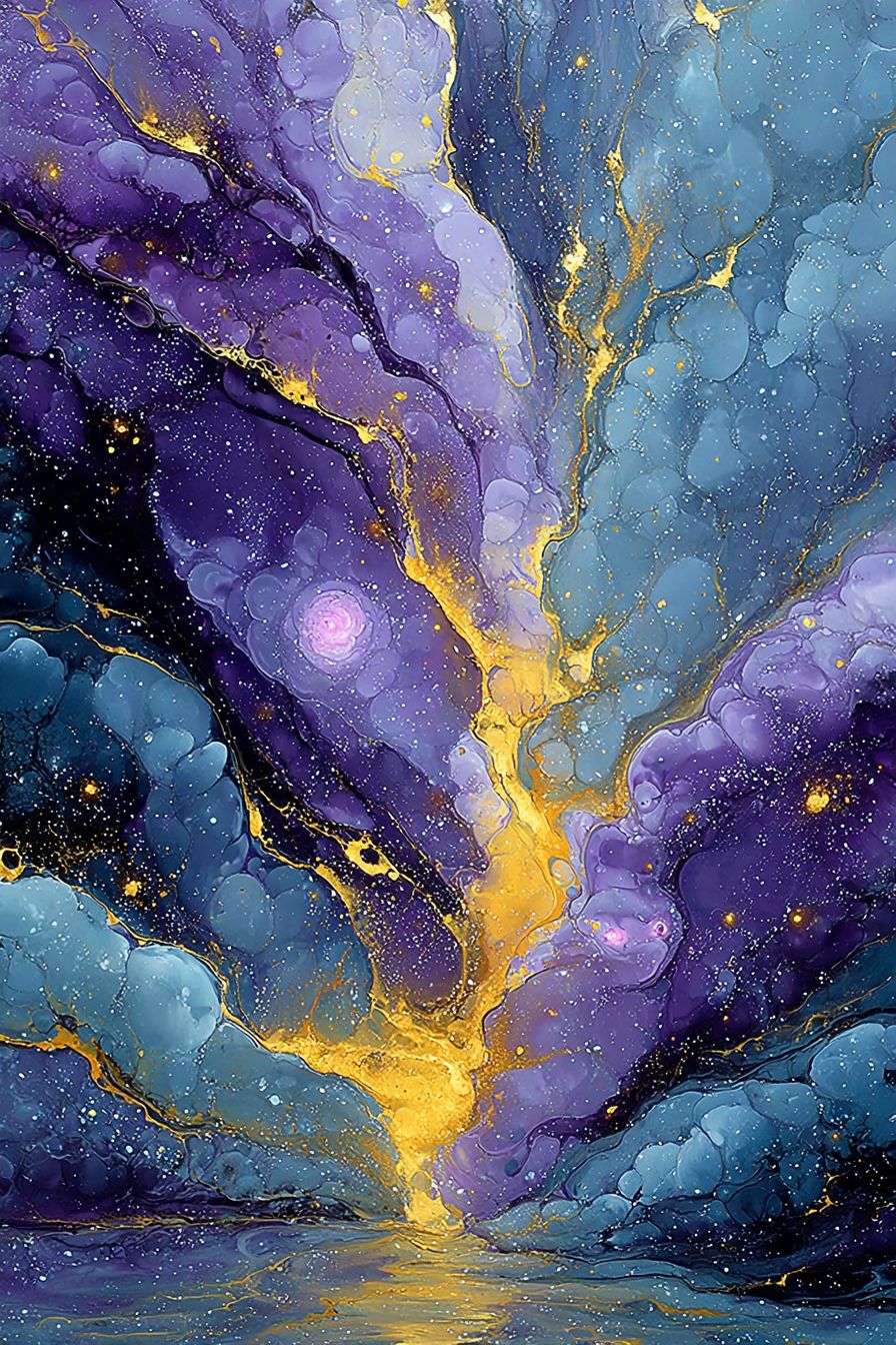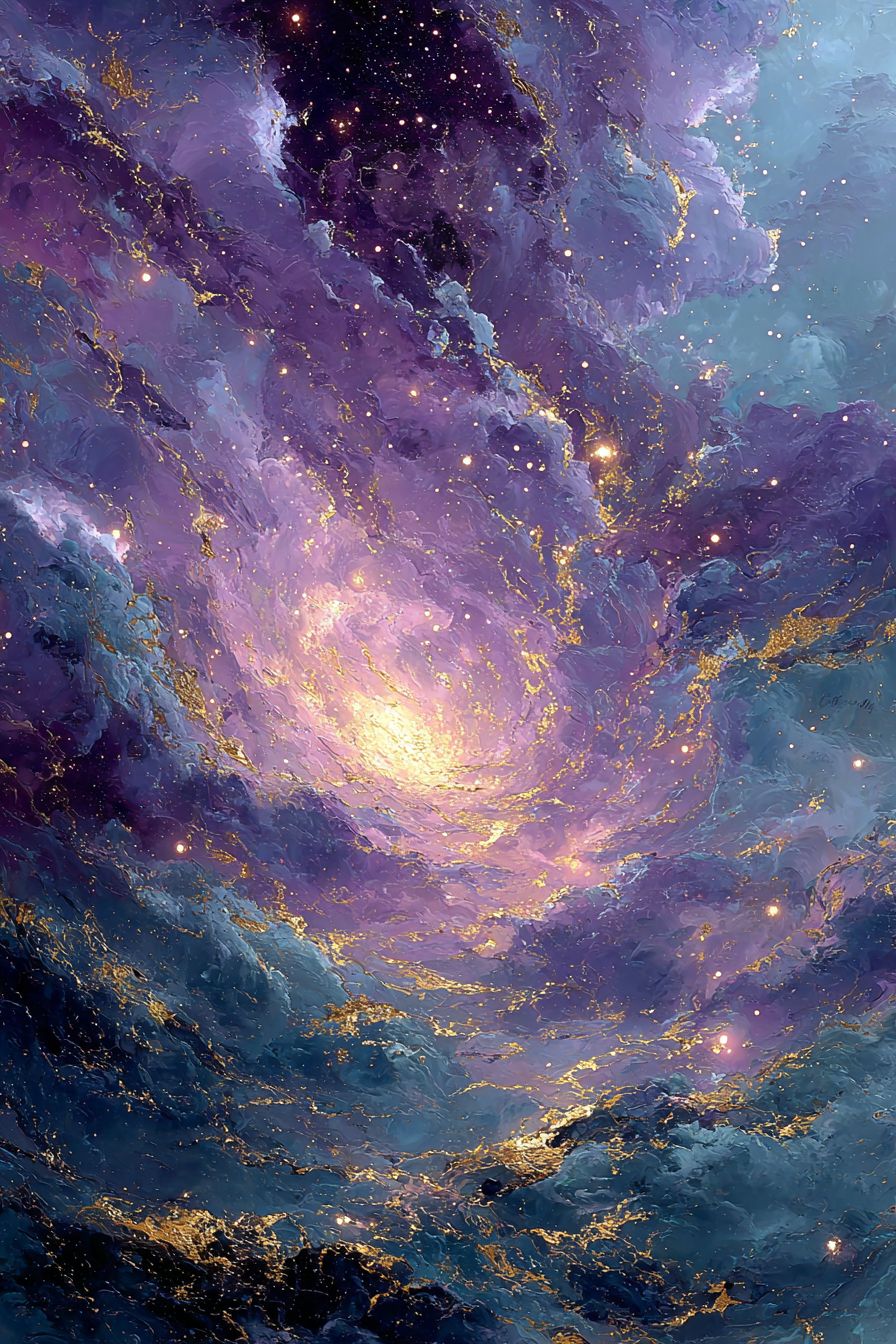 An abstract cosmic vortex swirling with galaxies, vibrant purples, blues, and golds, ethereal energy pulses, Jackson Pollock-inspired, dynamic composition, high resolution, otherworldly atmosphere --ar 2:3 --v 7.0 --s 750