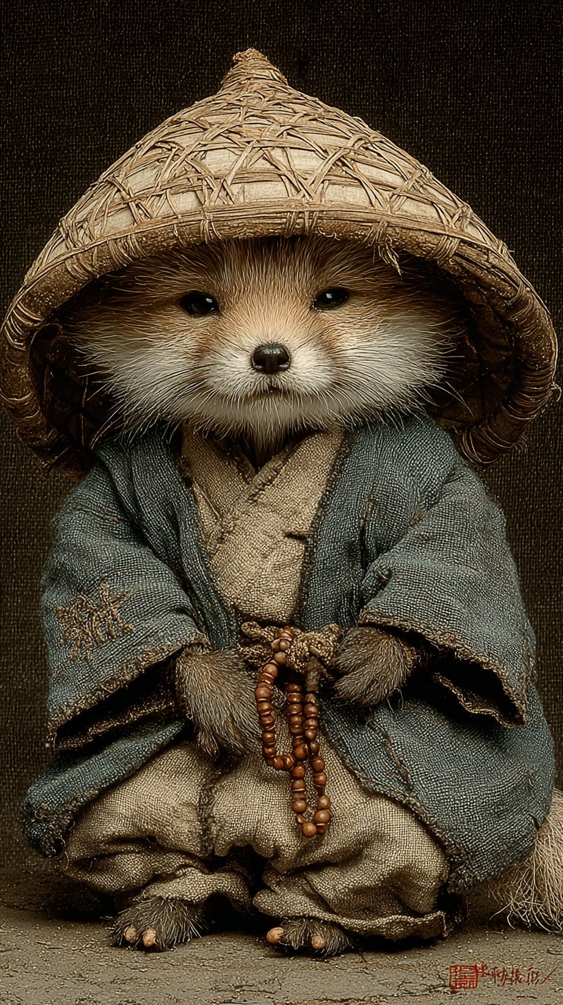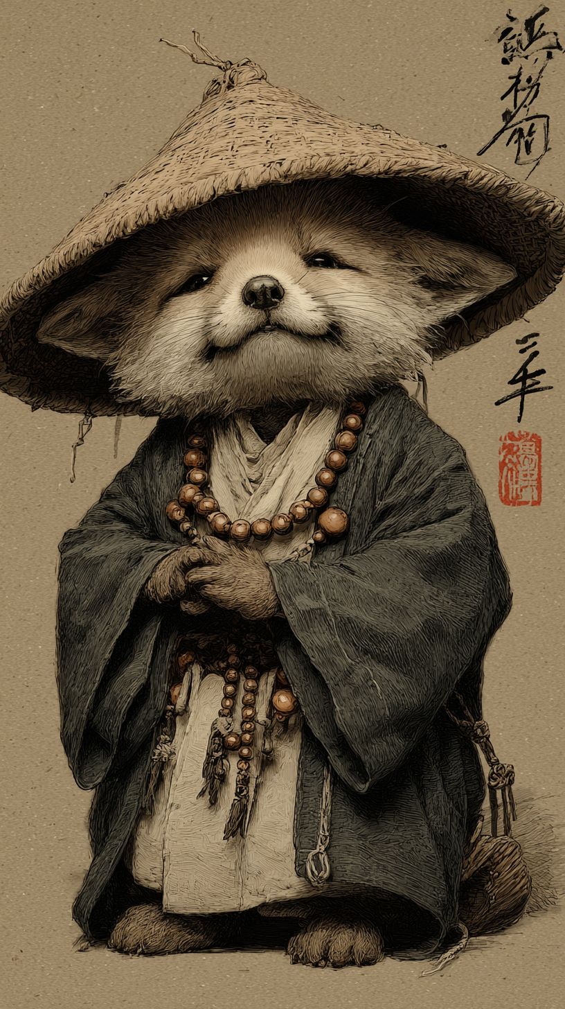 Feine Pinselstriche, kleiner Fuchs, Frontalansicht, mit einem Bambushut, im Schneidersitz, in Mönchskleidung, mit einer buddhistischen Perlenkette, die Hände gefaltet, süß, im alten chinesischen Stil.