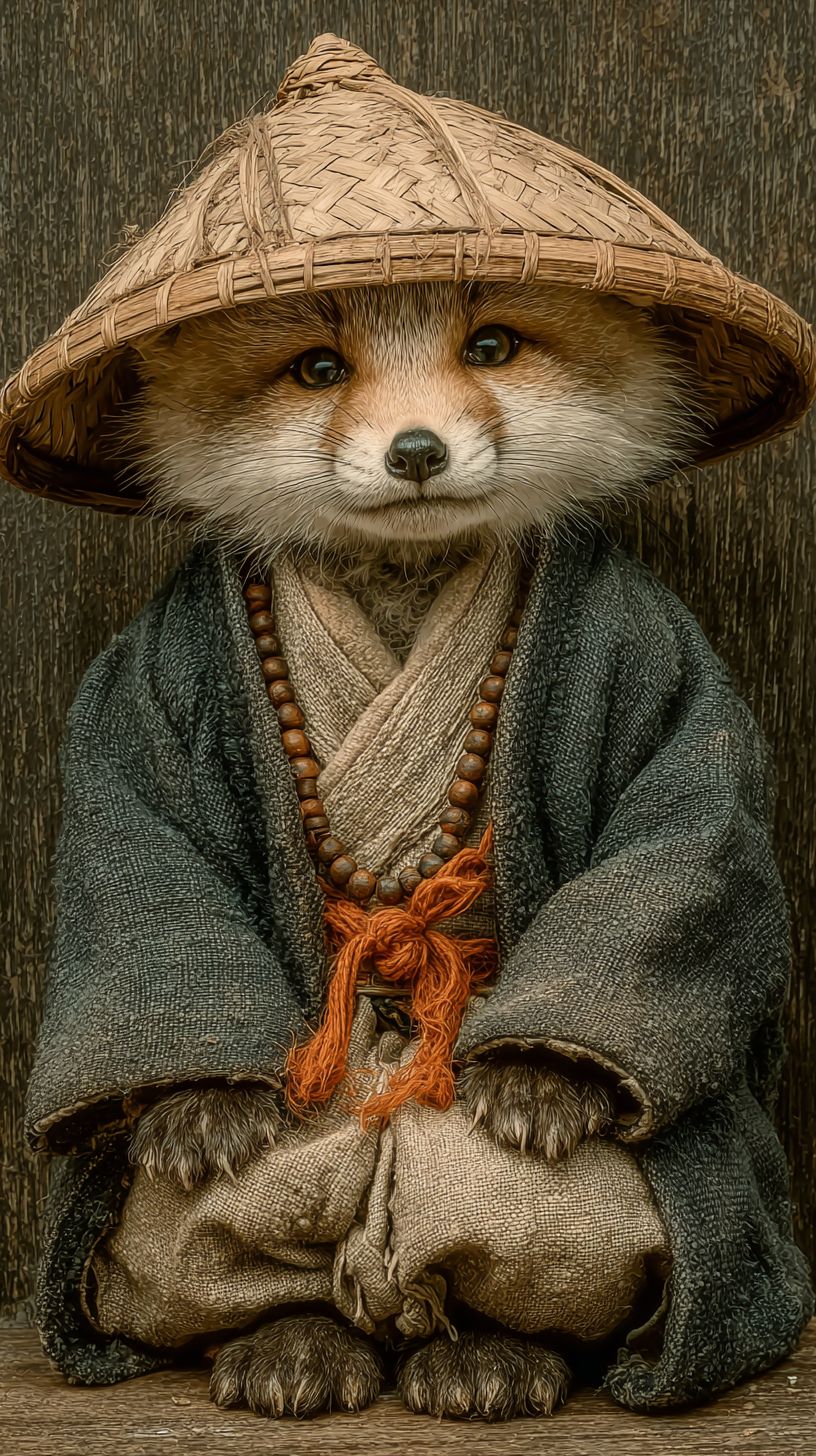 Ein süßer kleiner Fuchs in Mönchskleidung mit einem Bambushut, der im Schneidersitz sitzt