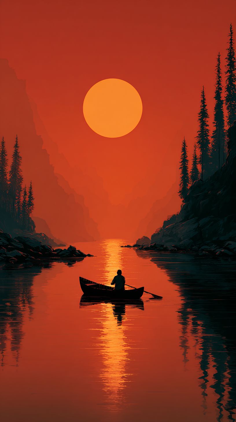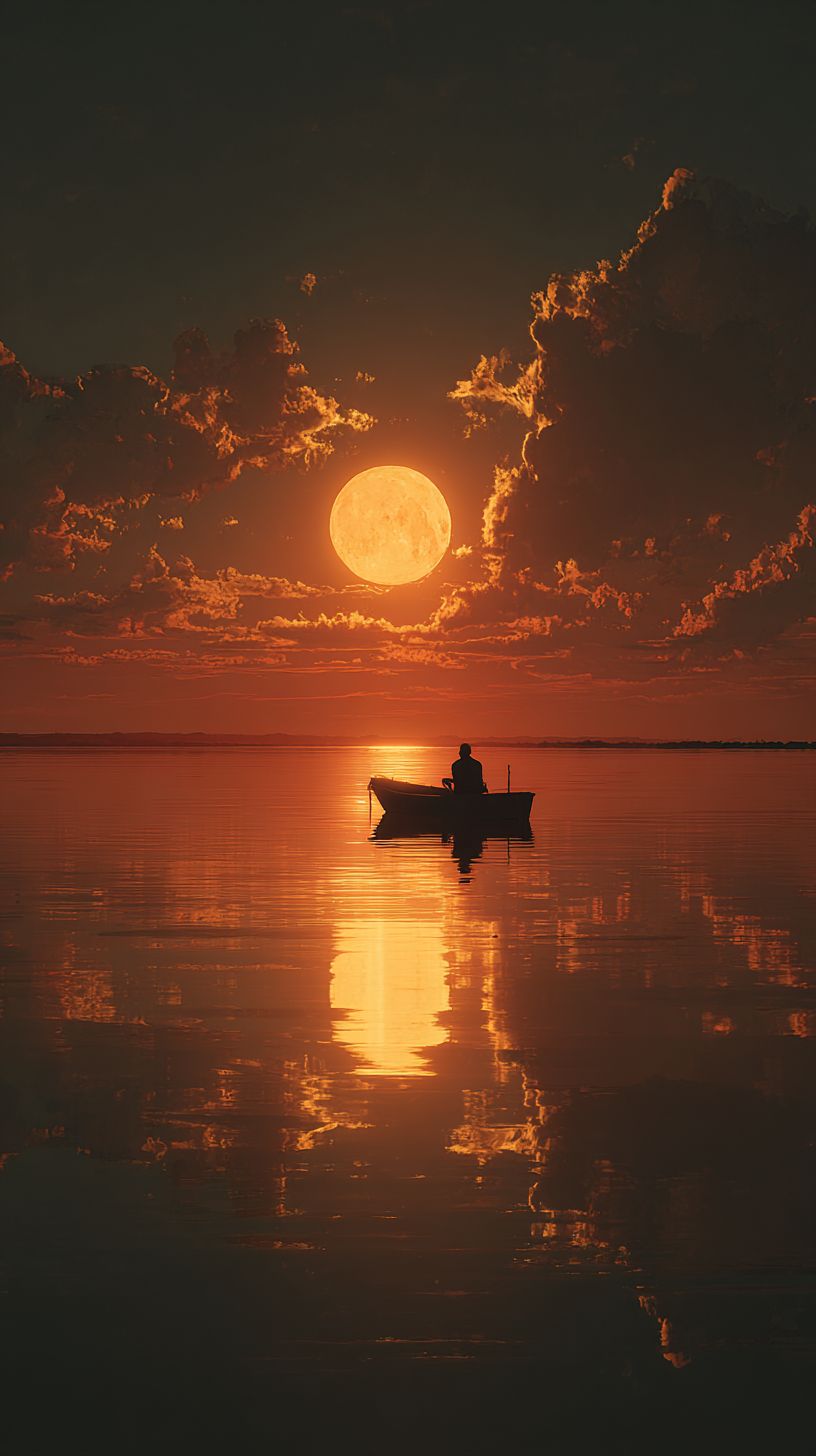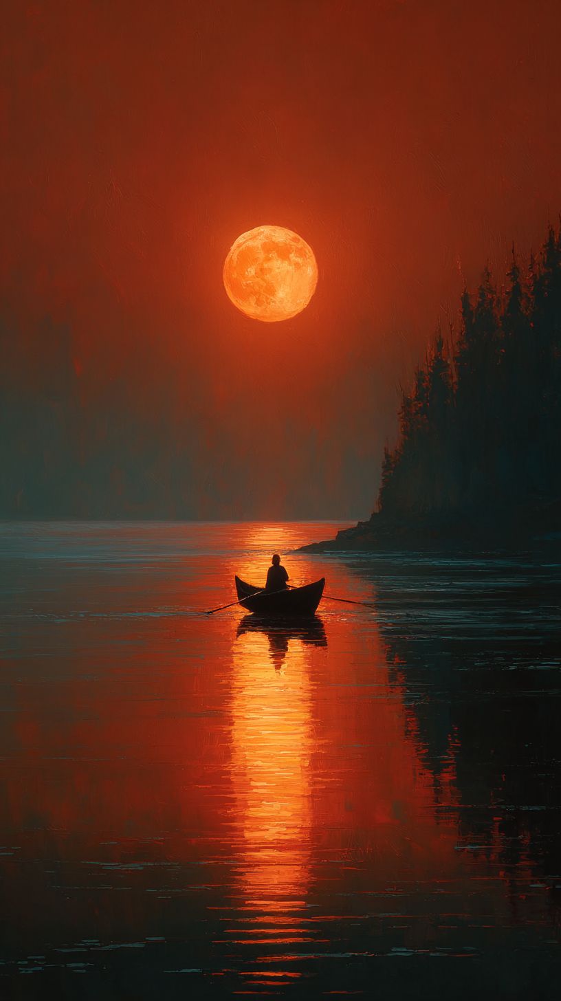 A serene scene of a lone figure in a boat, gently navigating a peaceful lake under the glow of an orange moon. The moon’s bright light stretches across the water, creating a dramatic, almost surreal atmosphere. --ar 9:16 --stylize 250