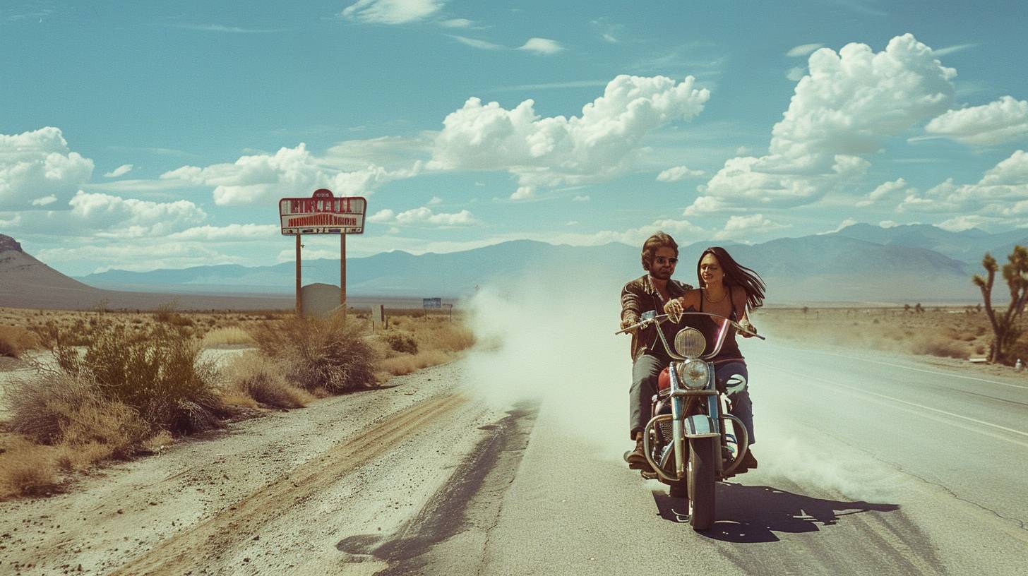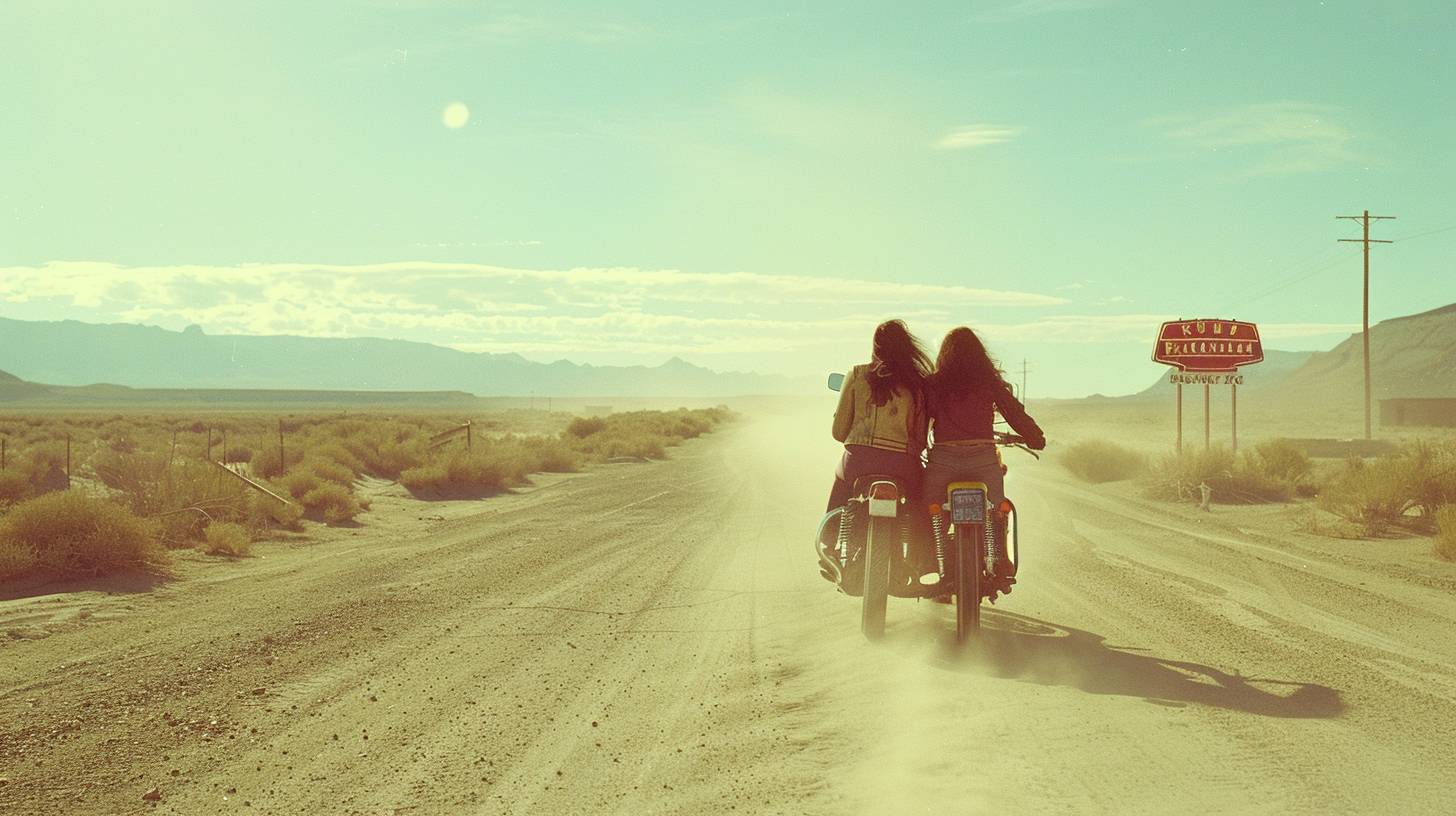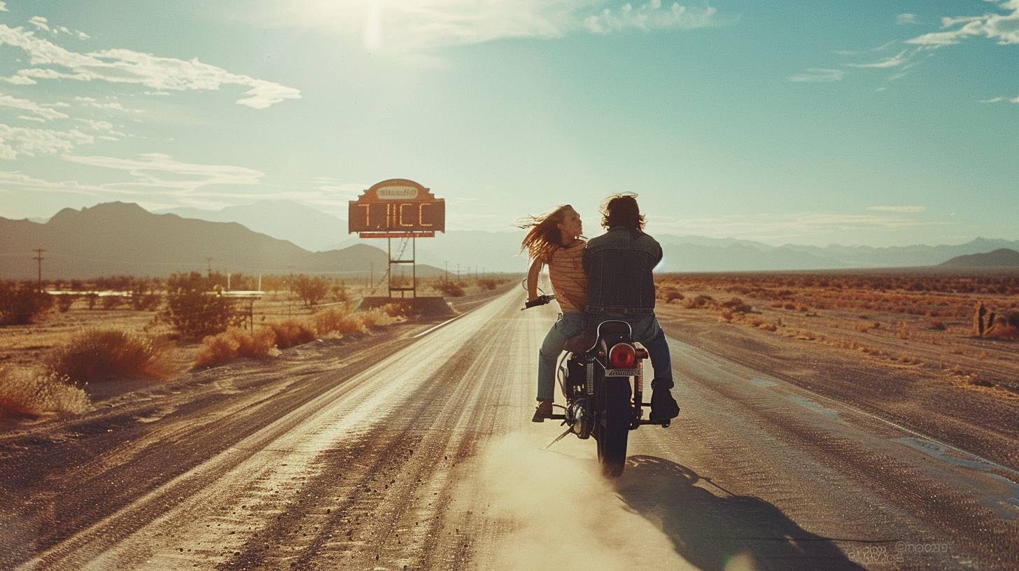 Couple on a motorcycle. Wind in their hair. Open road. Route 66. Midday in 1969. Desert landscape, distant mountains, a diner sign. Wide shot, full body. Shot on a Hasselblad 500C, Ektachrome film. Bright sunlight, dust trail, saturated colors. --ar 16:9 --v 6.0