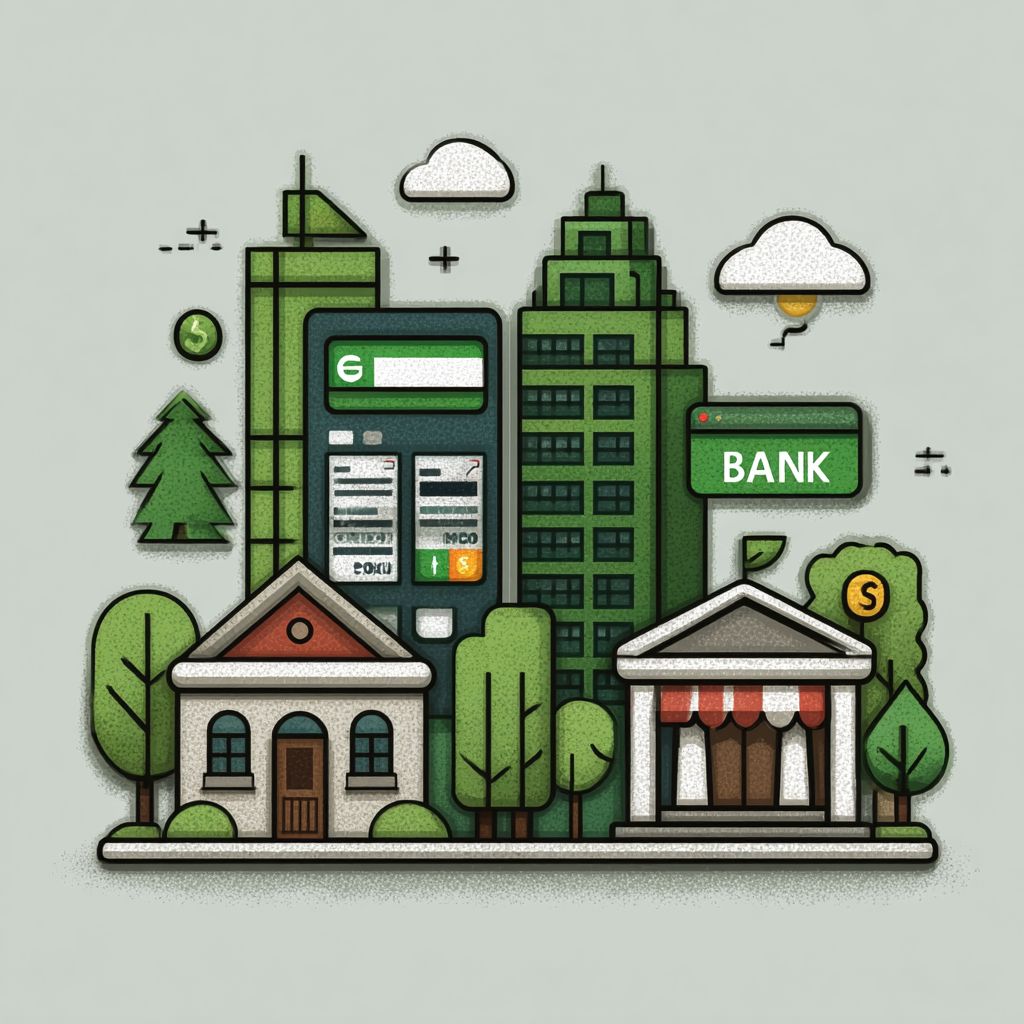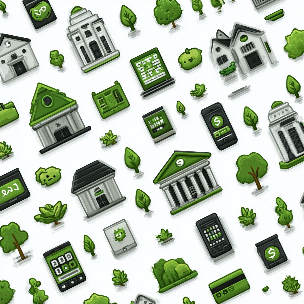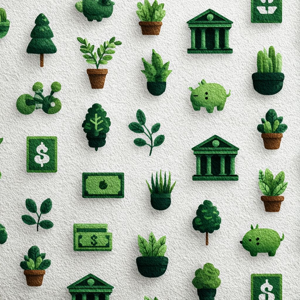 Create a design of icons arranged in creative chaos in various shades of green, and the icons should be related to banking, lineart, transparent background, --ar 1:1 --s 750