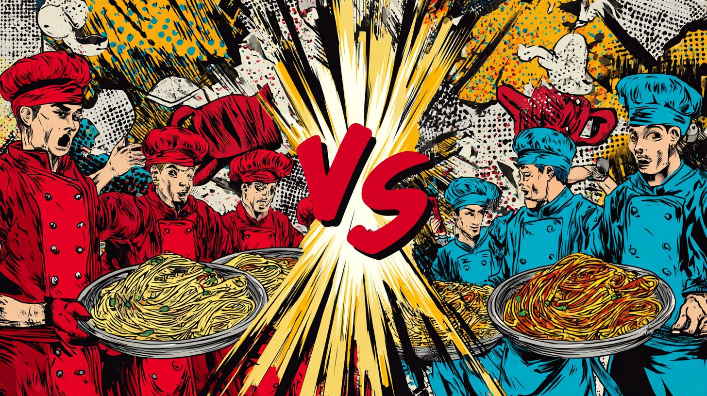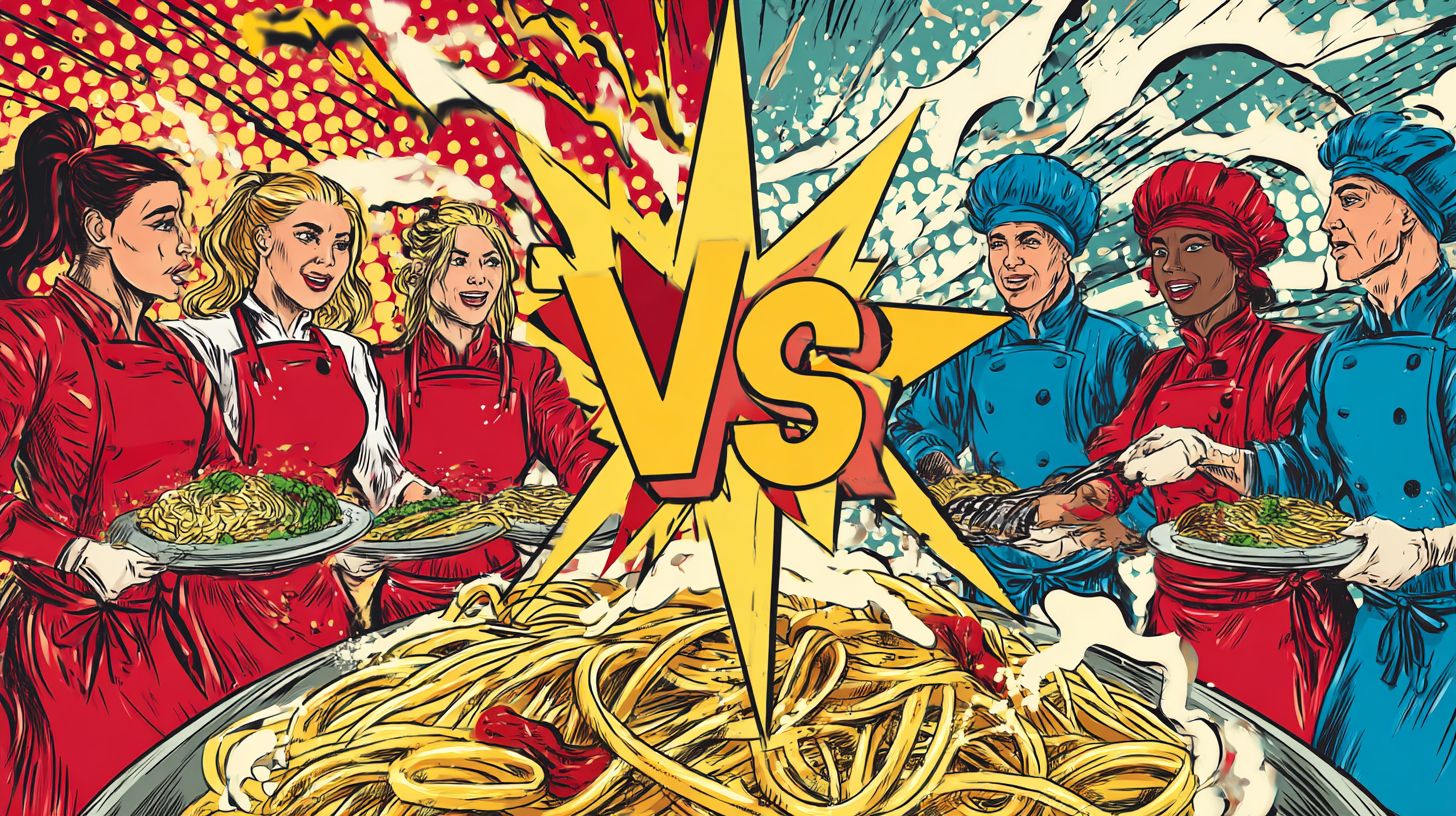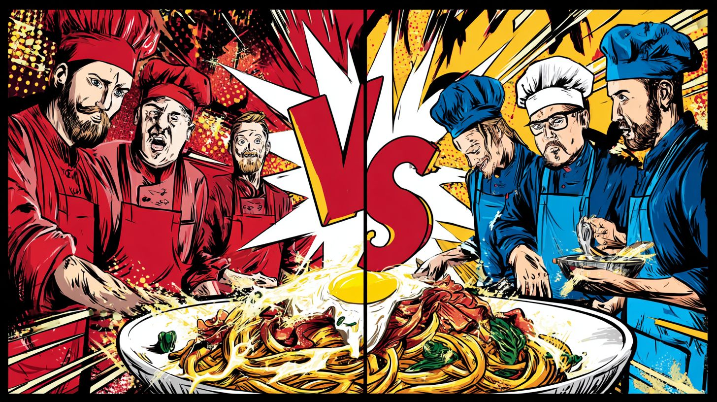Comic-Illustration im Stil, 16:9-Format, Splitscreen-Layout. Linke Seite: Team-Rote Köche in roten Schürzen, stilisiert wie Comic-Helden, die hinter einer ikonischen römischen Carbonara-Spaghetti mit knusprigem Guanciale, goldenem Eigelb-Cremesauce, Pecorino Romano, zerstoßenem schwarzem Pfeffer stehen, leuchtend und perfekt angerichtet, illustriert mit kräftigen Tintenlinien und Halbtönen. Rechte Seite: Team-Blaue Köche in blauen Schürzen, übertrieben und verspielt, die hinter einer wilden häretischen Carbonara-Spaghetti mit Sahne, Wurst, Petersilie, Zwiebeln, schmelzendem Käse, chaotisch und bunt stehen. Dynamischer Pop-Art-Hintergrund mit hellen Comic-Energieausbrüchen, 'Soundeffekt'-Strichen, hochkontrastierenden Farben. In der Mitte zwischen den Teams: große fette Comic-Schriftzüge 'VS'. Insgesamt ästhetisch wie ein Vintage-Superhelden-Comic-Cover, ausdrucksstarke Posen, dramatische Beleuchtung, gesättigte Töne.