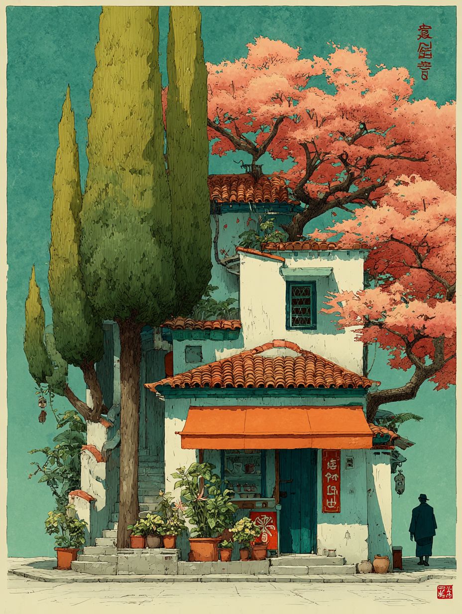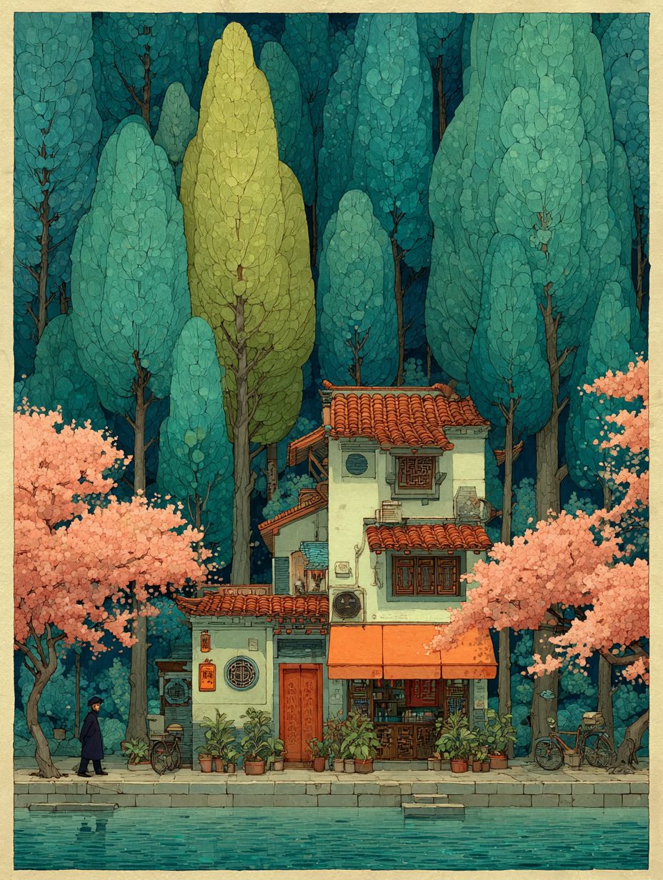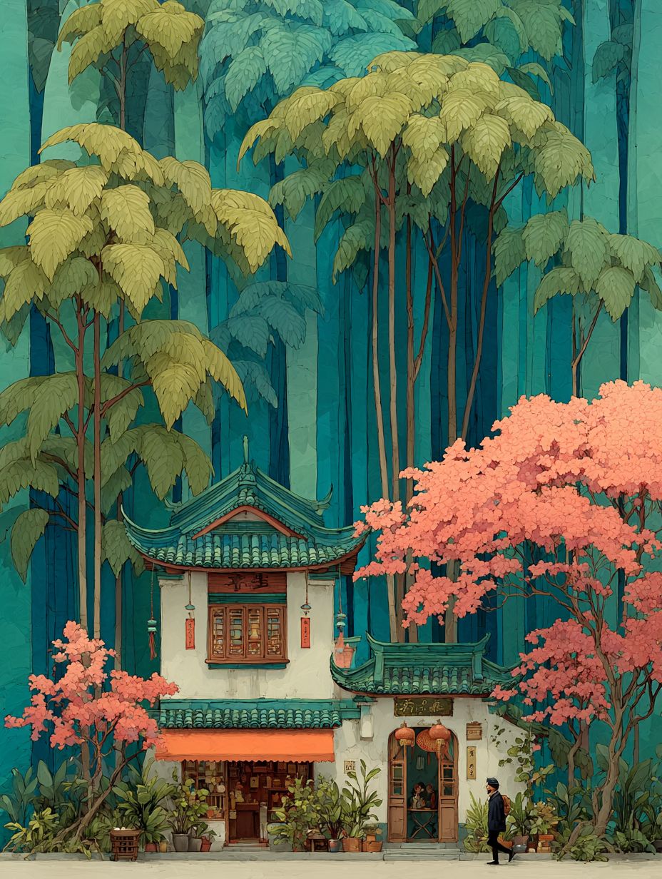 Eine ruhige Szene mit hohen, stilisierten Bäumen, die mit strukturiertem vertikalem Laub in verschiedenen Grüntönen, gelbgrün und hellgrün gestaltet sind, und einem kleinen traditionellen Gebäude mit einem gekrümmten Ziegeldach und weißen Wänden, einem orangen Laden mit Markise, Kühltöpfen und Chinesisch-Schildern, Kirschblütenbäume mit sanften rosa Blüten an den Seiten, einer einzelnen silhouettierten Figur, die davor geht, im hochdetaillierten Aquarellstil, sanften Farbverläufen, feinen Texturen, einer beruhigenden Farbpalette, die von Grünen und Rosatönen dominiert wird, ruhiger Atmosphäre.