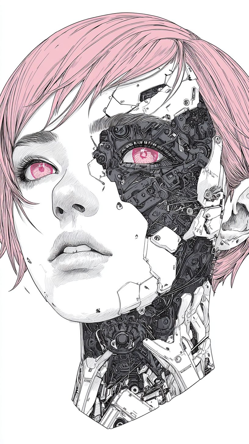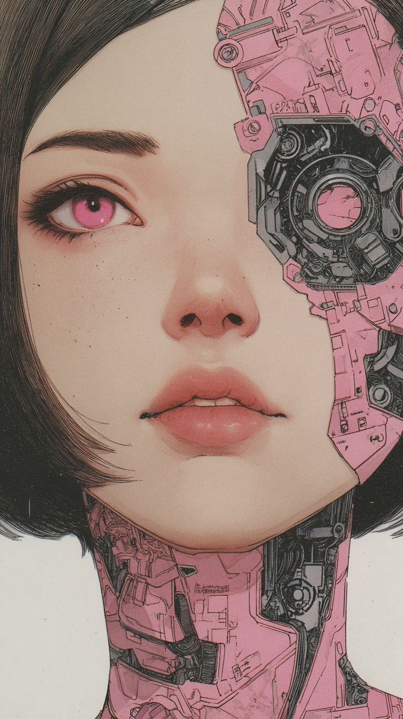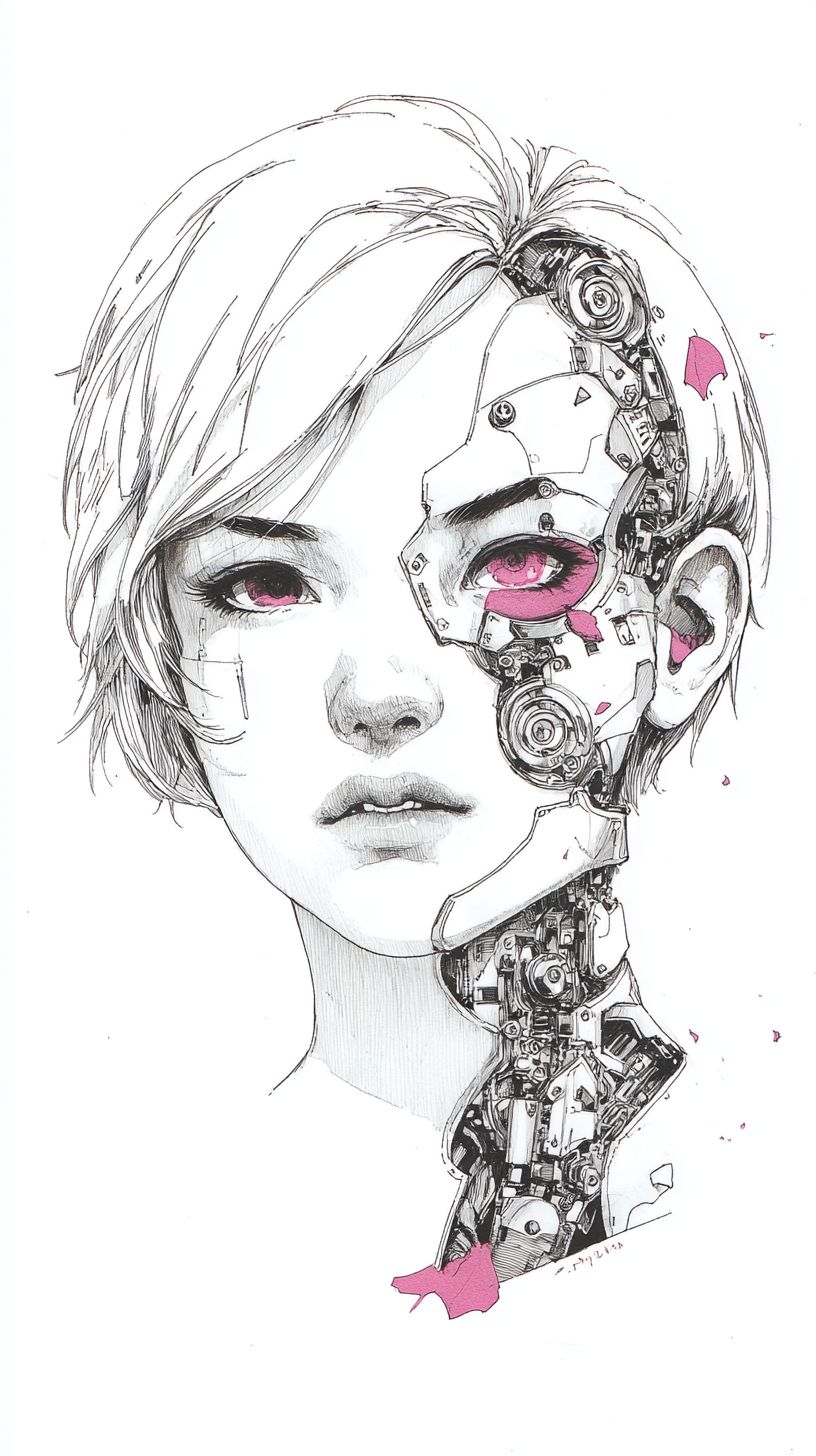 A beautiful young woman with short hair and pink eyes. Half of her face is cybernetic skin made from black metal parts. She has a sticker-style tattoo design on a white background, in the style of Katsuya Terada, Kawacy, Yoji Shinkawa, Conrad Roset, Ilya Repin, and Natalia Rak. This is a portraiture with mechanical elements, a character design. --ar 9:16 --v 7.0