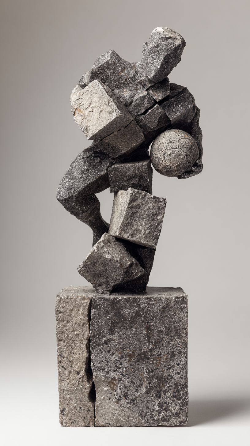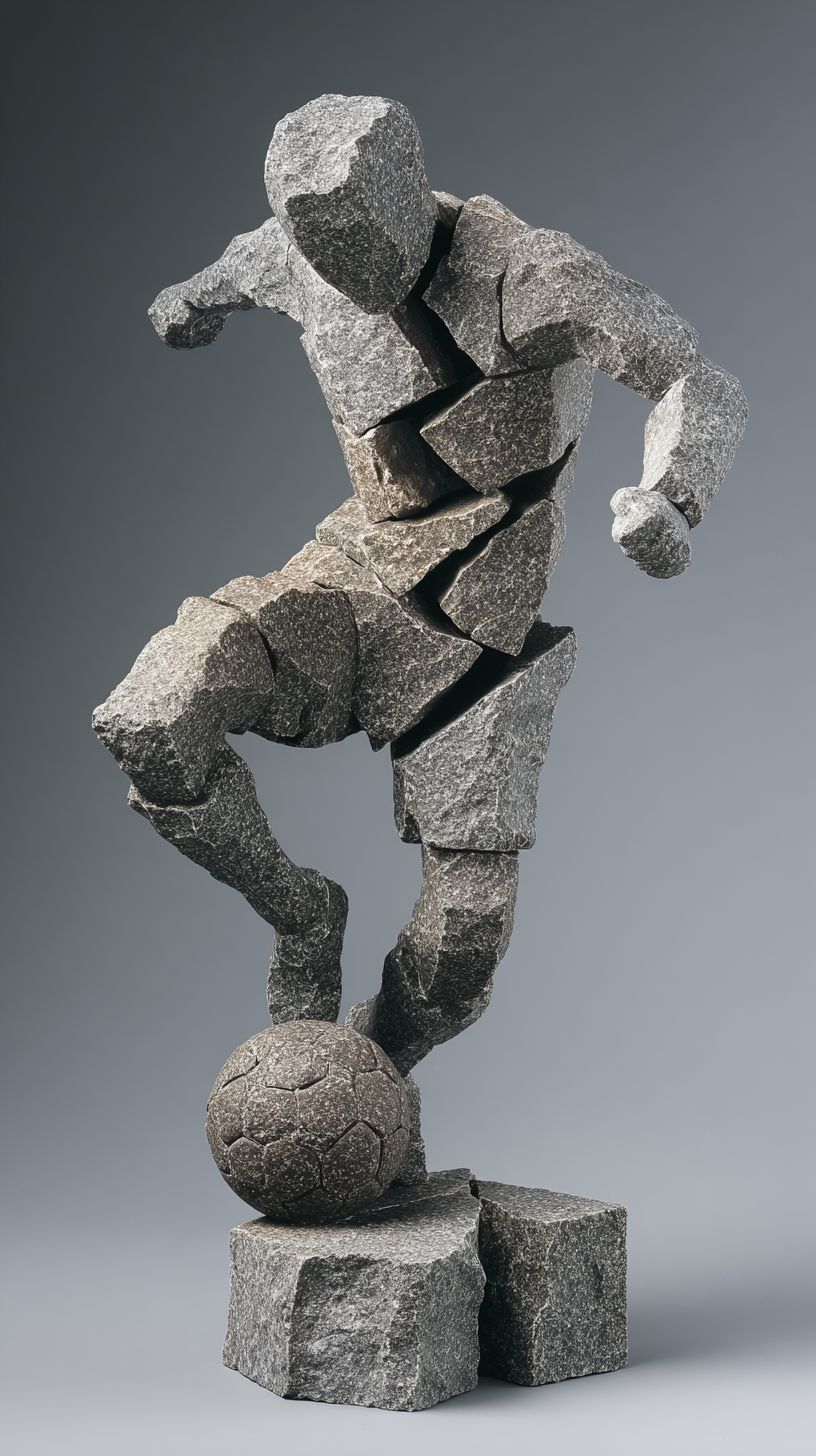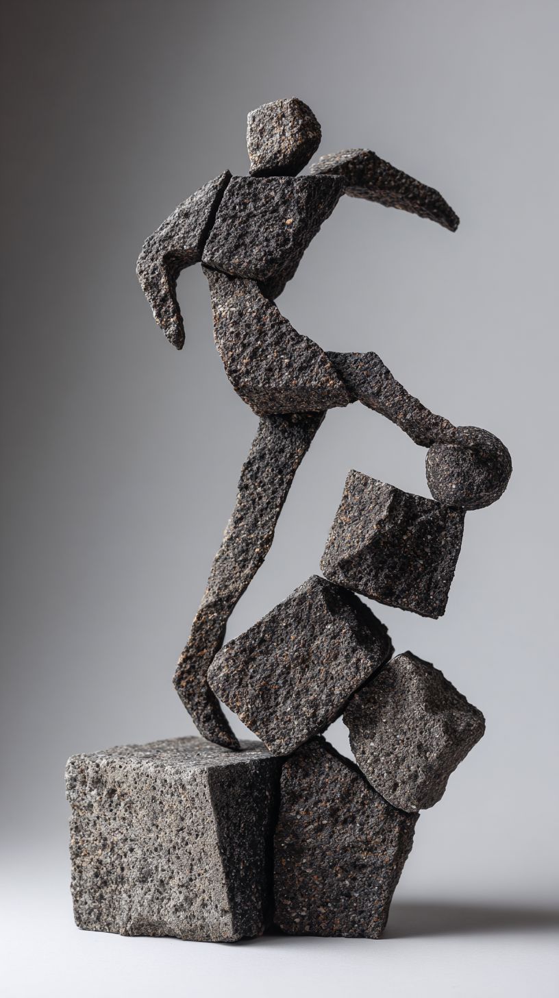 On a Nordic minimalist-style tabletop stands a three-dimensional stone artwork, which depicts a modern football player in a classic action of playing football. The piece is composed of numerous irregular, rough basalt blocks of varying shapes and sizes. The entire work is extremely concise, yet at the same time highly rich in abstract artistry and dynamism. The seams where the stones are joined are very distinct, with the rough texture and granularity of the basalt clearly visible. --ar 9:16 --v 7.0