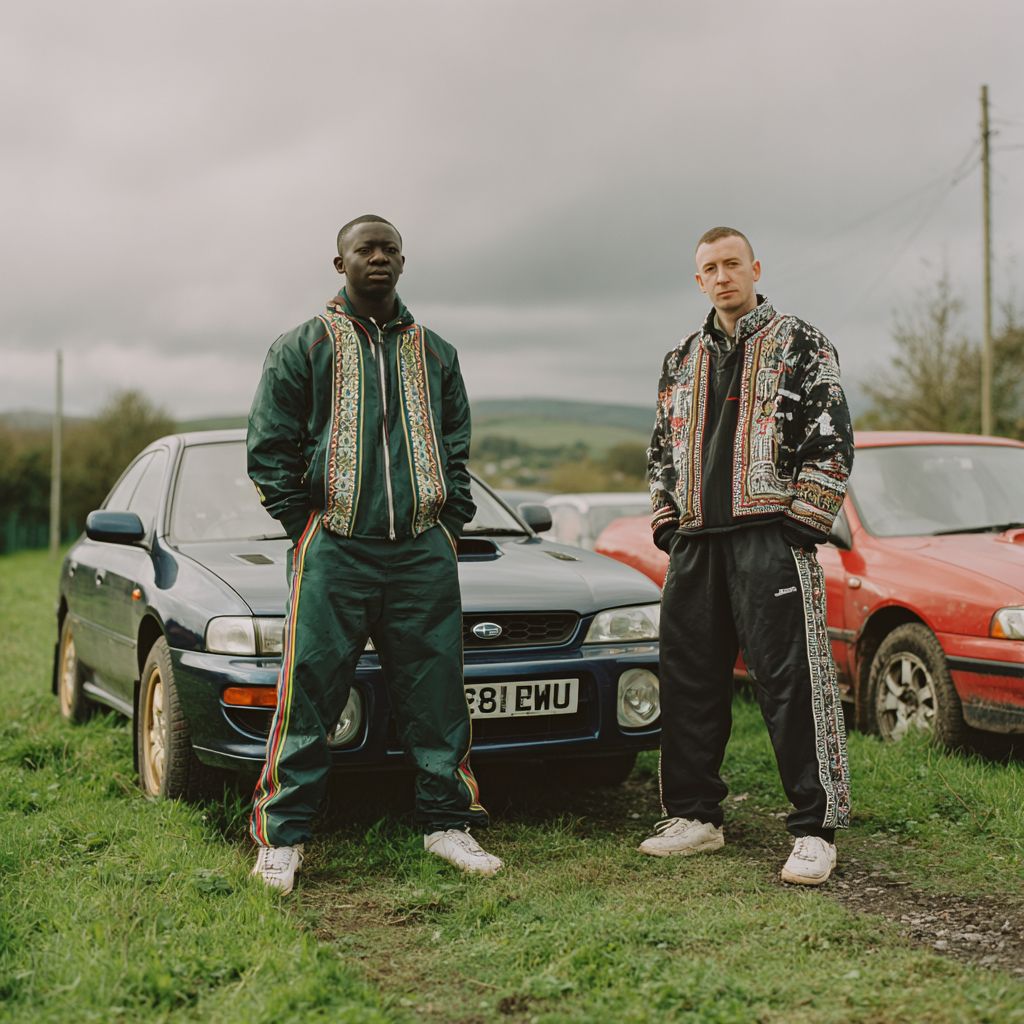 Analoge Portra-Film, körniges Foto, aufgenommen mit einer Leica M6, zwei irische Männer in Trainingsanzügen mit traditionellen irischen Mustern in den Details, sie stehen in einem Feld außerhalb von Belfast vor ihren Subaru-Autos.