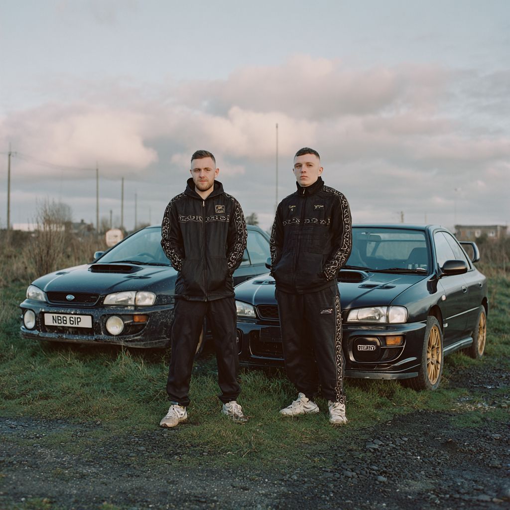 Zwei irische Männer in Sportanzügen mit traditionellen irischen Mustern stehen in einem Feld außerhalb von Belfast vor ihren Subaru-Autos