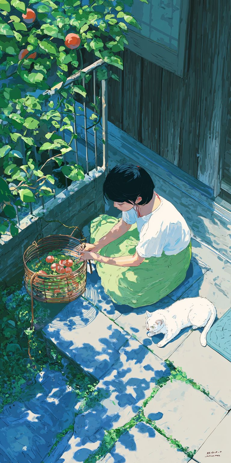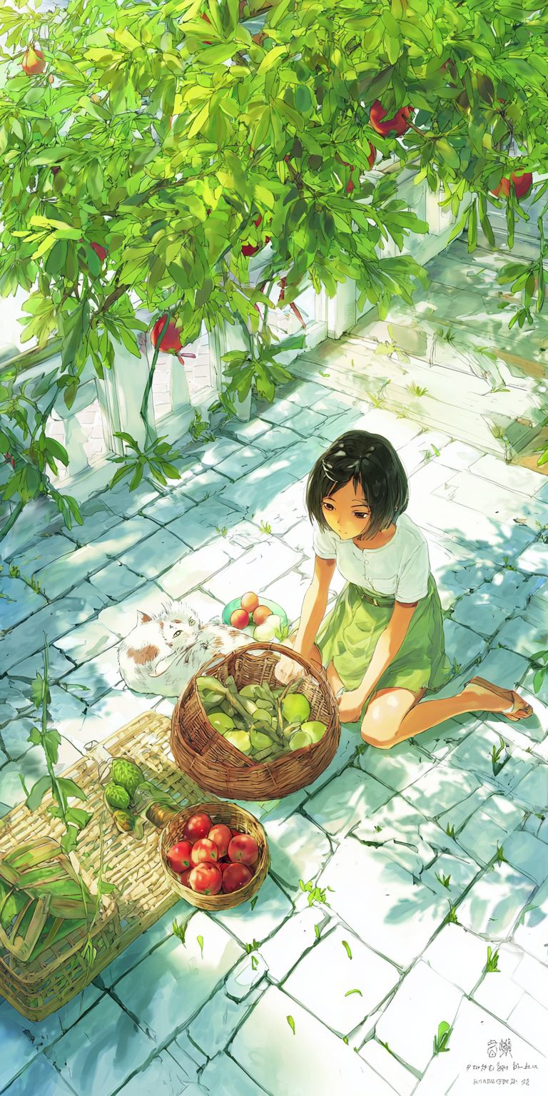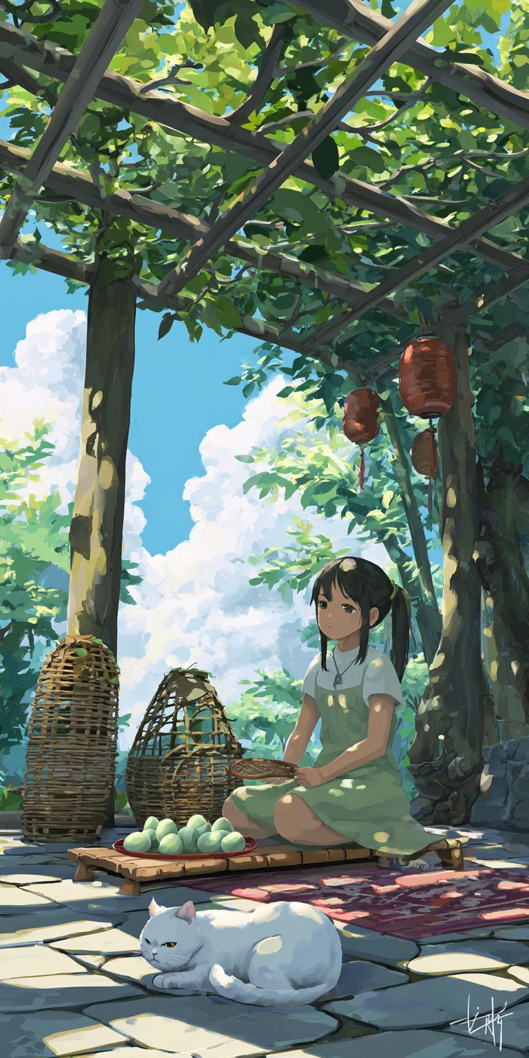 Makoto Shinkai style, high saturation, fresh style. In the sky, magnificent white clouds.The early summer sun slanted across the pomegranate treetops, scorching the courtyard's bluestone slabs. A young girl in a light green cloth skirt sat beneath a locust tree, a bamboo basket spread across her lap. Inside, she counted and tucked her early summer eggs, wrapped in colorful silk thread. Some red resembled small lanterns, some green resembled jade beads, into a woven egg-cage. A white cat curled up on a bamboo mat at her feet, its tail tip occasionally sweeping the ground. Suddenly, its ears perked up--the chirping of cicadas echoed from the cucumber racks outside the fence. As soon as the first "cicada" sounded, it had already scurried under the racks, clawing at the vines and swaying, startling the newly-rippled cucumbers, causing them to drop morning dew onto its snow-white backs. --ar 1:2 --stylize 50