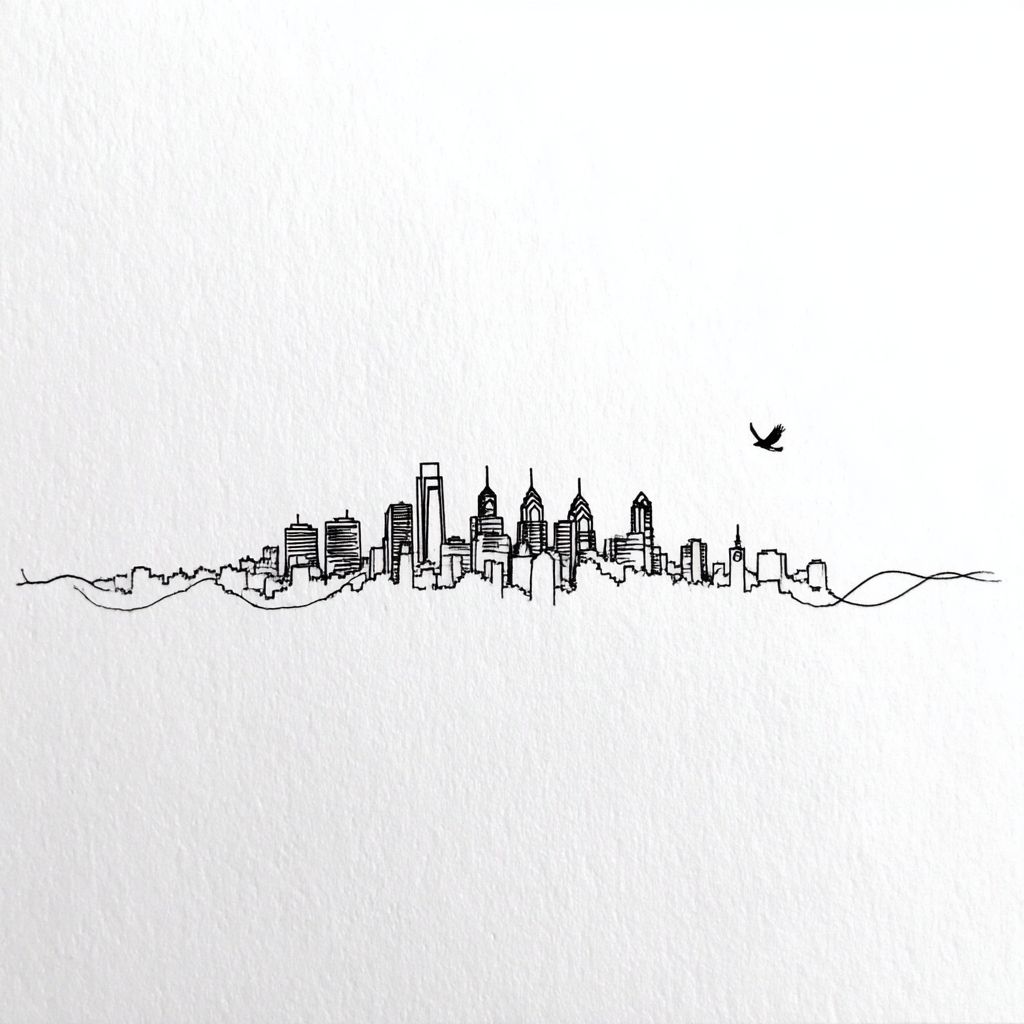 single continuous thin line drawing, minimal outline sketch of Philadelphia skyline, delicate and elegant, with a simple eagle subtly incorporated into the design, white background, black ink lines only, no shading, no color, ultra minimalist, interpretive, fine line tattoo style