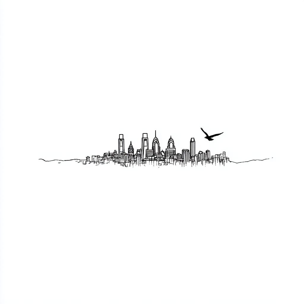 Einzelne kontinuierliche dünne Linzeichnung, minimalistischer Umrissskizze der Skyline von Philadelphia, zart und elegant, mit einem einfachen Adler, der subtil in das Design integriert ist, weißer Hintergrund, nur schwarze Tintenlinien, keine Schattierung, keine Farbe, ultra minimalistisch, interpretativ, feine Linientattoo-Stil.