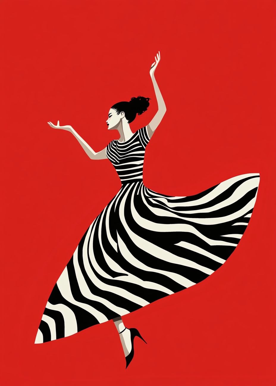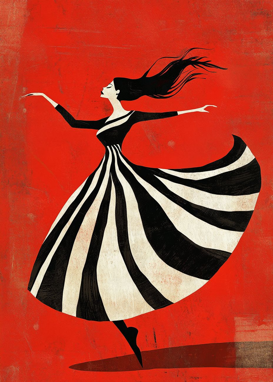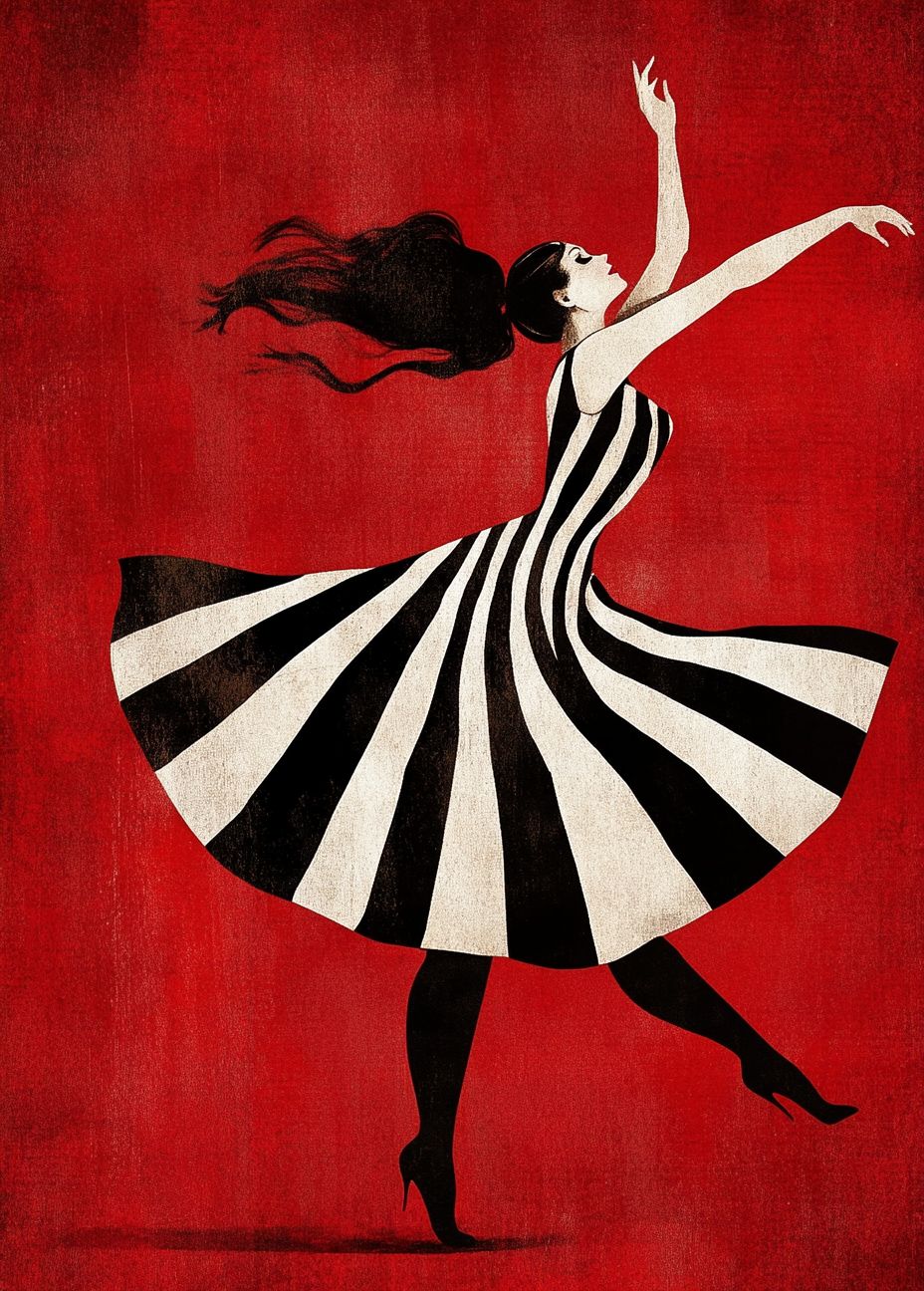 A painting of a woman in a black and white striped dress dancing on a red background, in a minimalistic art style, poster design in the style of Saul Bass. --ar 71:99 --v 6.1