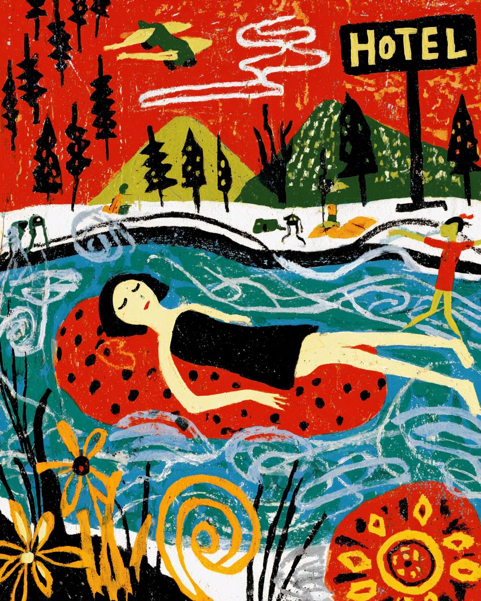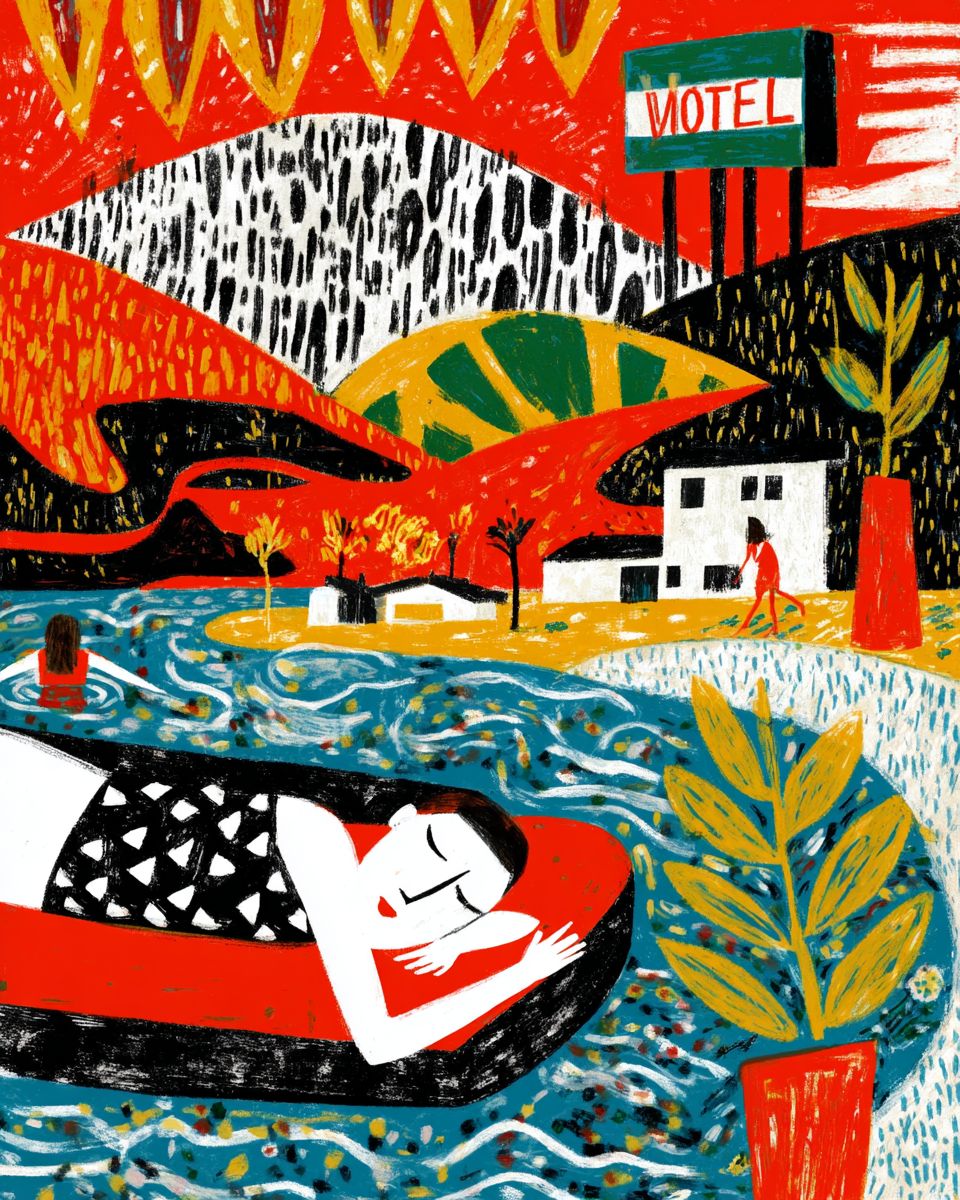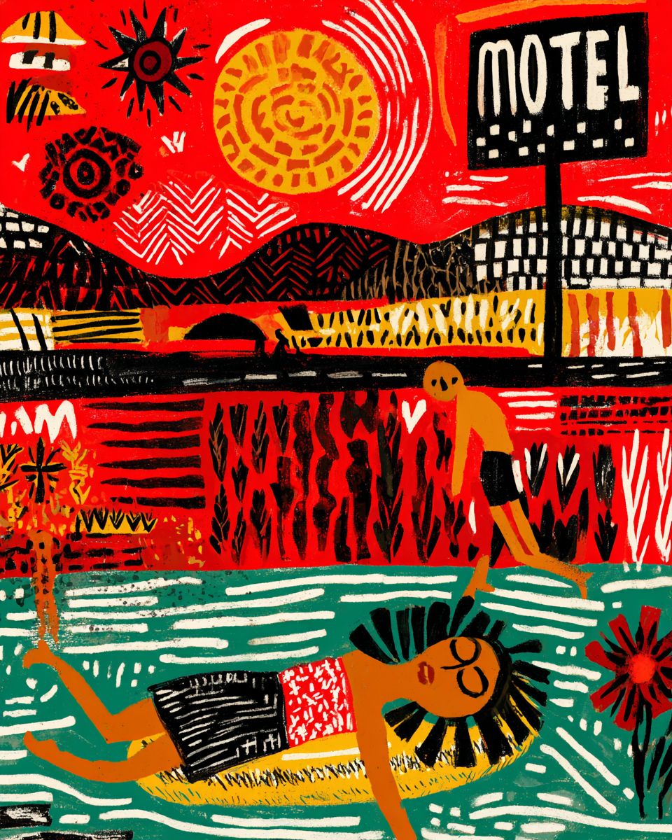 Ein lebendiger Blockdruck, der eine Frau zeigt, die mit dem Bauch auf einer aufblasbaren Poolmatratze liegt, während ihre Arme im Wasser hängen und ihr Gesicht auf einem Kissen ruht. Die Szene spielt am Pool eines Motels in Zentraltexas aus den 1960er Jahren. Ein Kind springt vom Rand des Pools ins Wasser. Im Hintergrund sind sanfte Hügel und ein großes Motelzeichen auf einem hohen Pfahl.