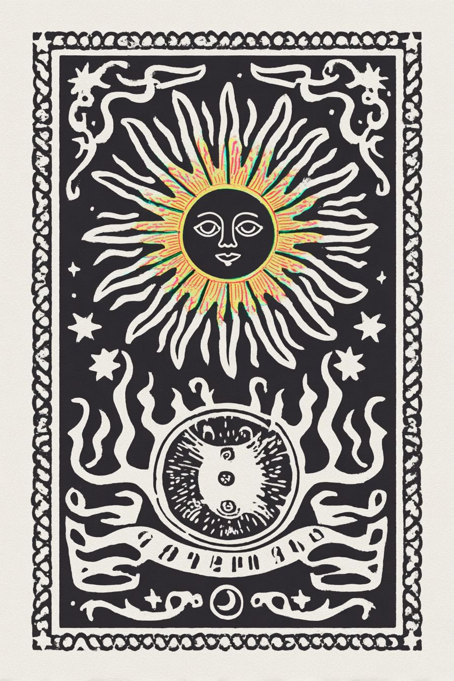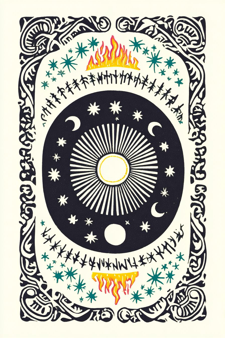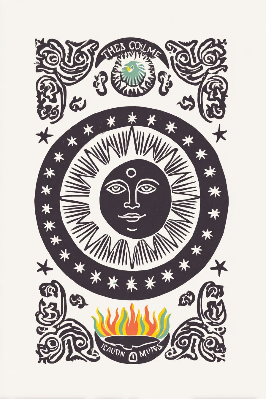 Die Sonne und der Mond sind von Sternen umgeben, mit einer Sanduhr und Flammen im Linolschnitt-Stil