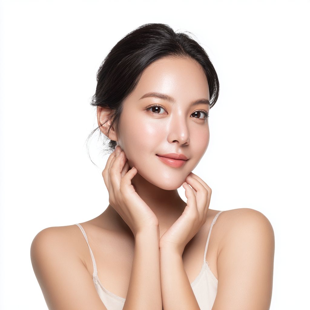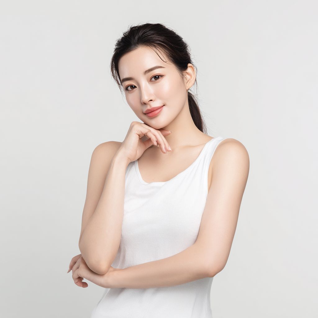An Asian skincare female model, any different positions , professional commercial photography, white background, Full body shot,Realistic style, with skin texture,Distant view,soft lighting, showing white skin, --v 7.0 --raw