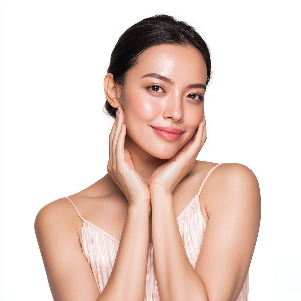 Ein asiatisches weibliches Modell präsentiert Hautpflegeprodukte