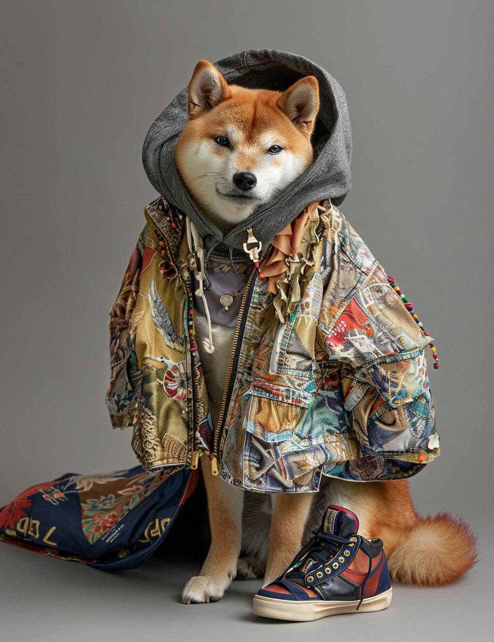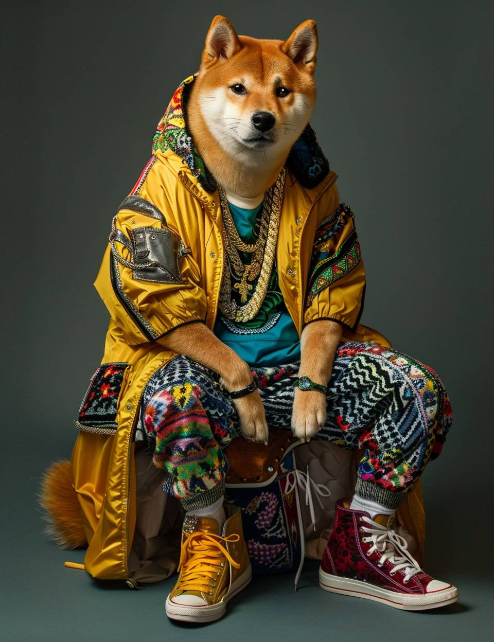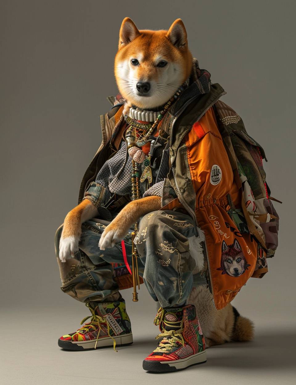 Im Stil eines Modeshootings ein Foto eines anthropomorphen Shiba Inu Hundes, der große Hip-Hop-Kleidung aus den 1990er Jahren und Sneakers trägt, Fantasie, wahnsinnig detailliert und kompliziert, hypermaximalistisch, High Fashion.
