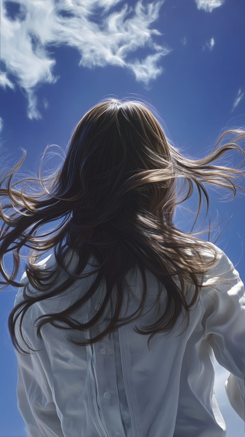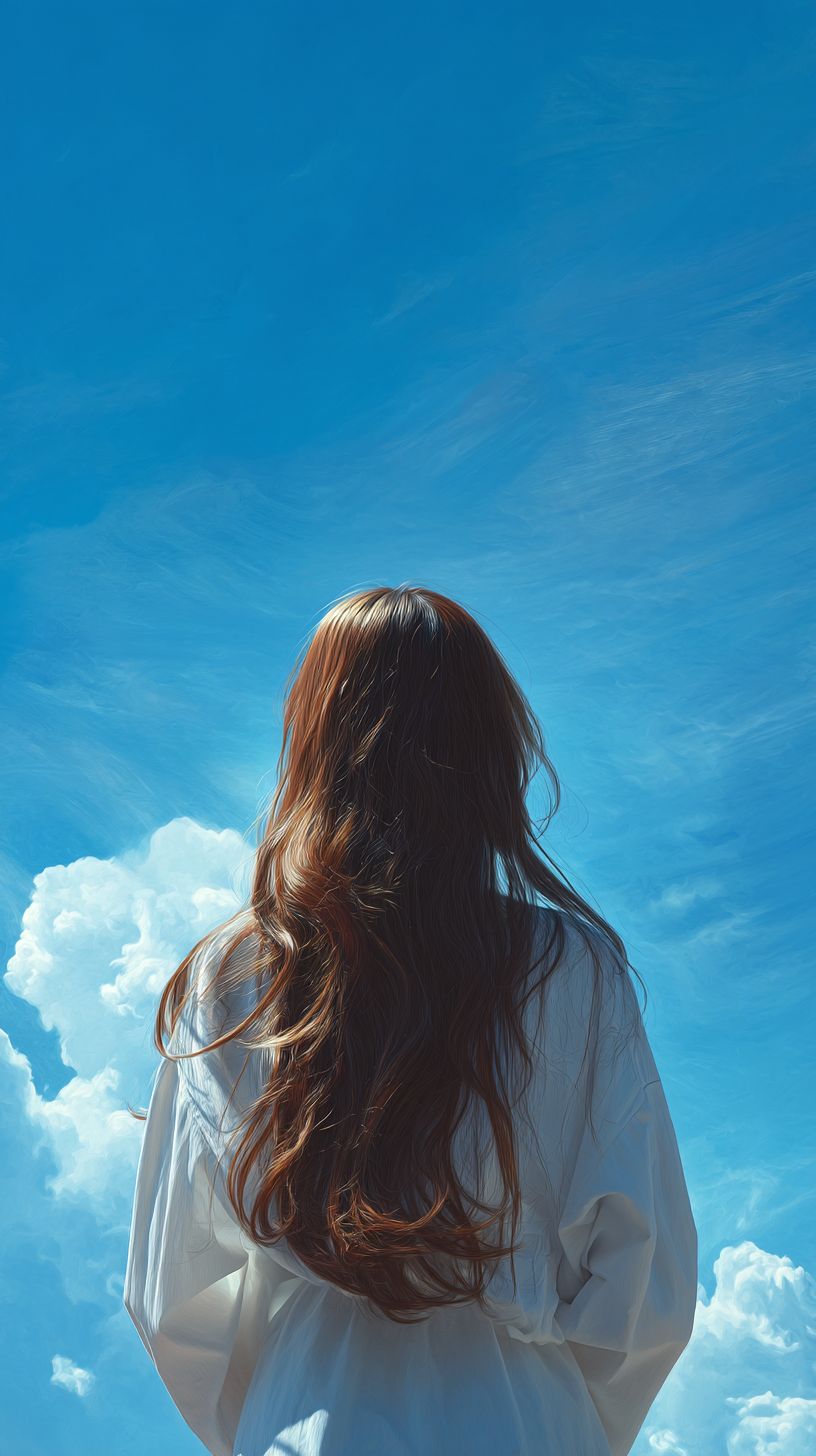 Ein ultra-realistisches Foto eines hübschen japanischen Idols von hinten, mit langen fließenden Haaren, das zum blauen Himmel aufblickt. Das Motiv dominiert den Rahmen, mit einem minimalistischen sauberen Hintergrund mit Wolken, sanftem Tageslicht, kinorealistischer Perspektive mit starker Tiefe, iPhone-Hintergrundstil, lockscreen-freundliche Komposition.