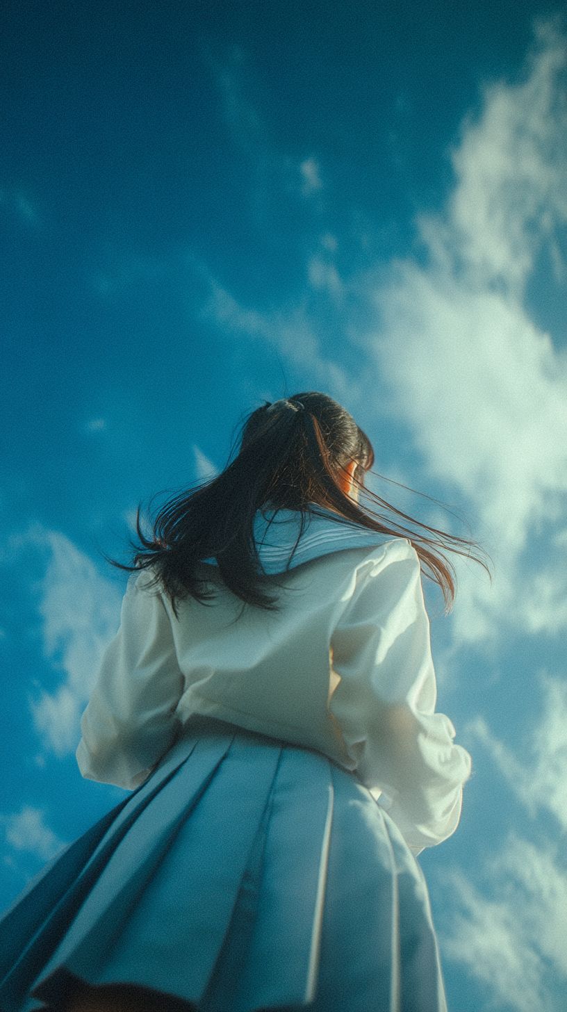 ultra realistic photo of a pretty Japanese idol girl seen from behind, long hair flowing, looking up toward the blue sky, subject dominates the frame, minimal clean background with clouds, soft daylight, cinematic perspective with strong depth, iphone wallpaper style, lock screen friendly composition --chaos 15 --ar 9:16 --quality 2