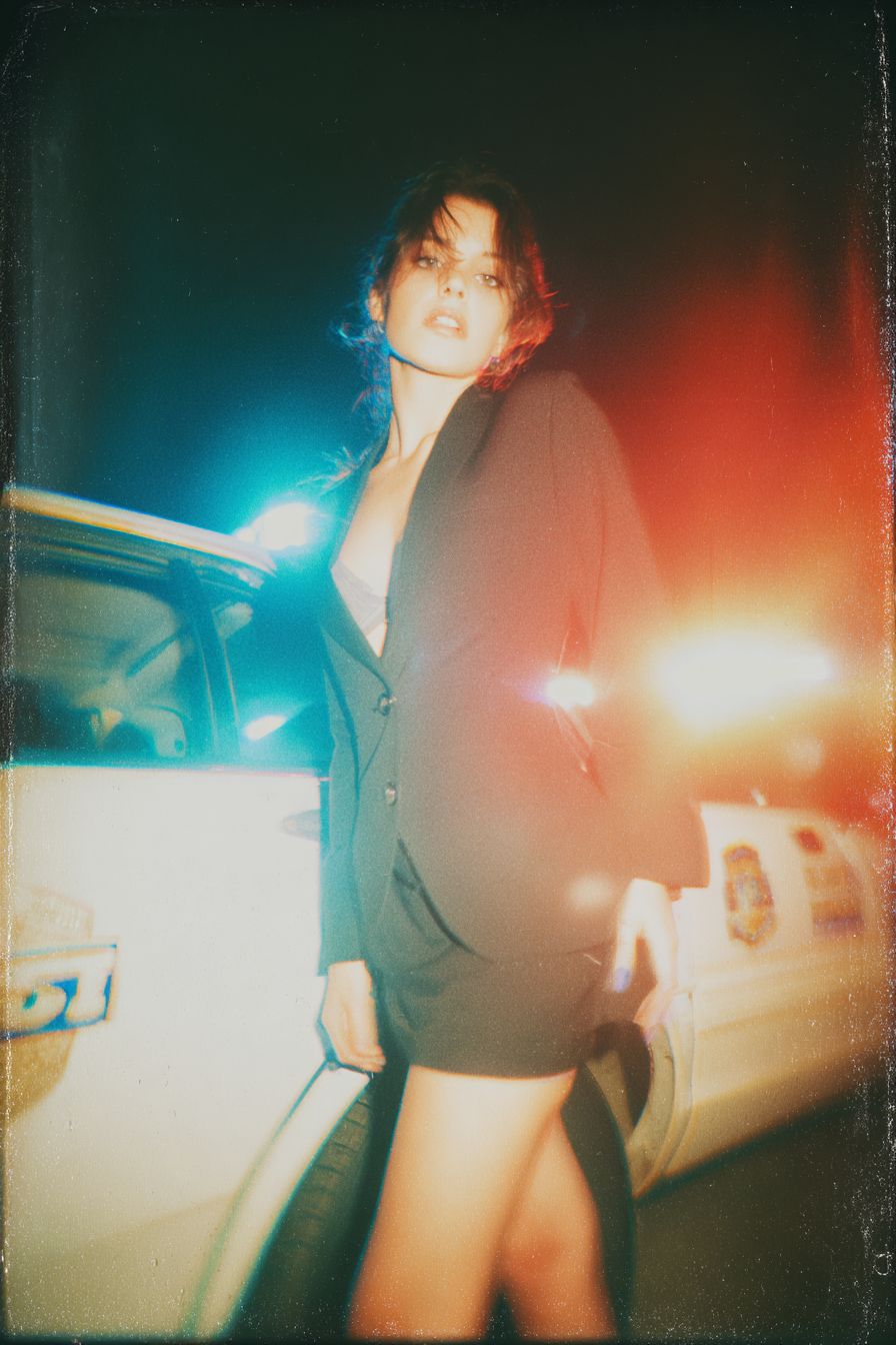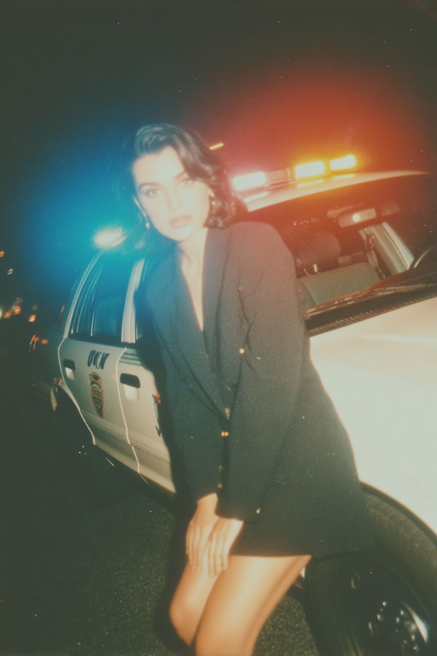 a polaroid photograph of an edgy woman in a black blazer and skirt, posing confidently beside a police car with flashing lights at night. the image has a vintage vibe, with a strong contrast between light and dark, a grainy texture, and a nostalgic aesthetic. the shot is candid, with a retro fashion photography style. the image is high resolution and very detailed, with a soft focus and a cinematic feel. --ar 85:128