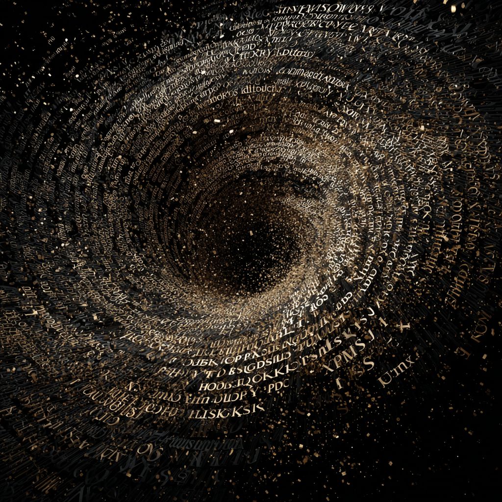 Goldene Buchstaben und Satzzeichen bilden einen wirbelnden Strudel, dicht am Zentrum gepackt und nach außen in die Dunkelheit streuend, schwarzer Hintergrund, subtiler Glanz an den Kanten, minimalistisches Design, Gefühl von Tiefe und Bewegung.