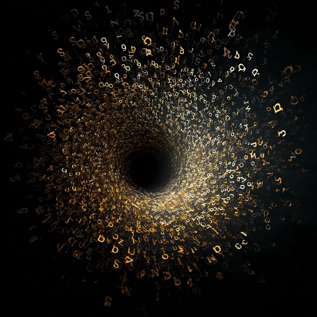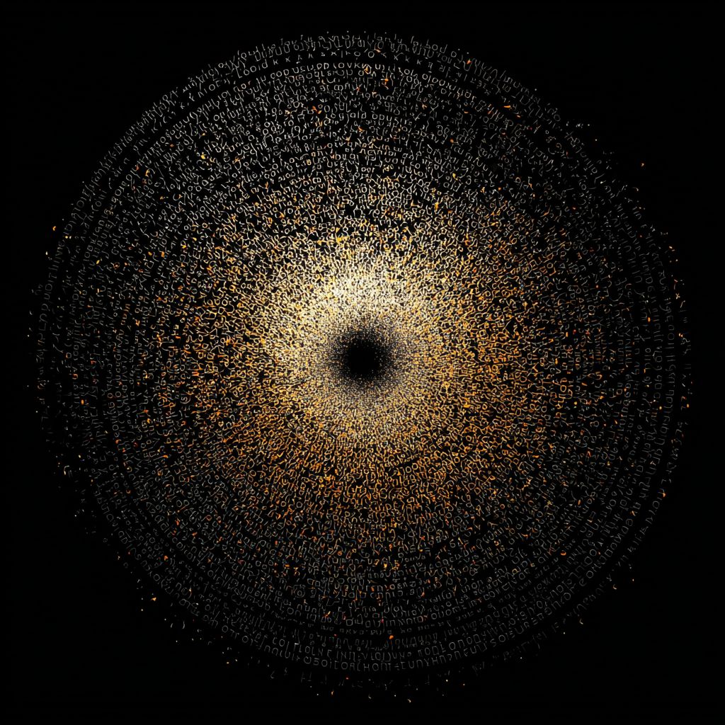 golden letters and punctuation marks forming a swirling vortex, densely packed at the center and dispersing outward into darkness, black background, subtle glow on edges, minimal design, sense of depth and motion --v 7.0