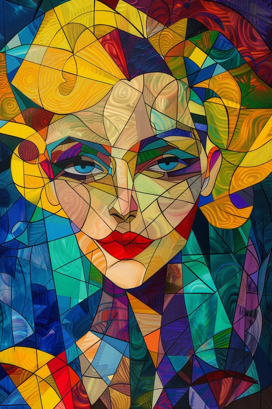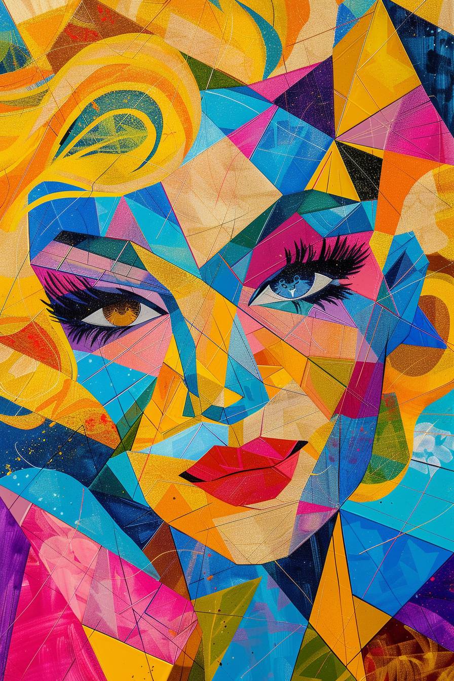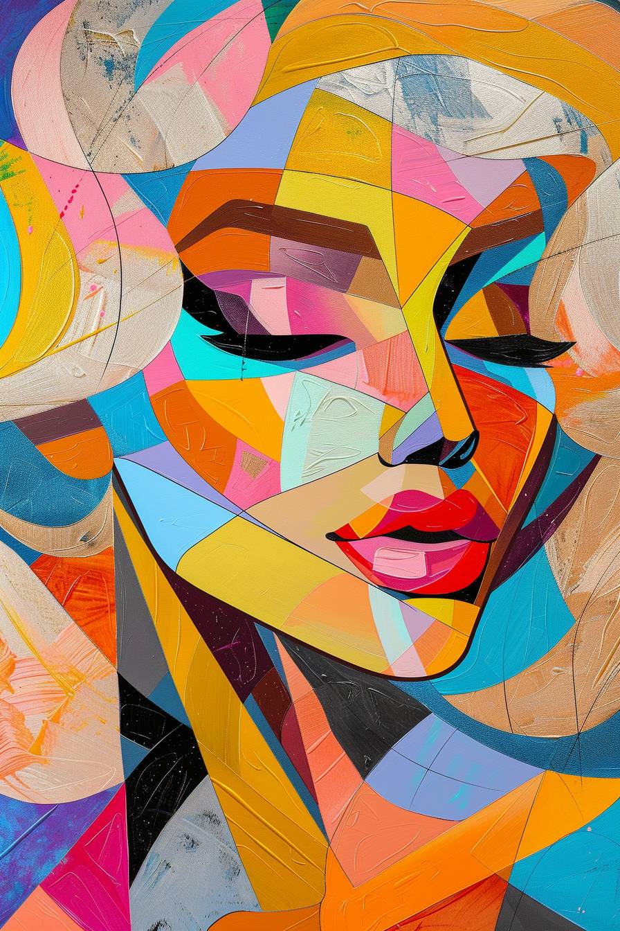 Cubism. A cubist abstract acrylic painting of singer Dolly Parton. 50 years old. Big blond hairstyle. Colorful cubist face. Art Deco colors. 1980s cubism. Fluorescent color background. In the style of Full Woman, Cubism Art Print by Atelier ArtesIA - Fy --ar 2:3 --v 6.0
