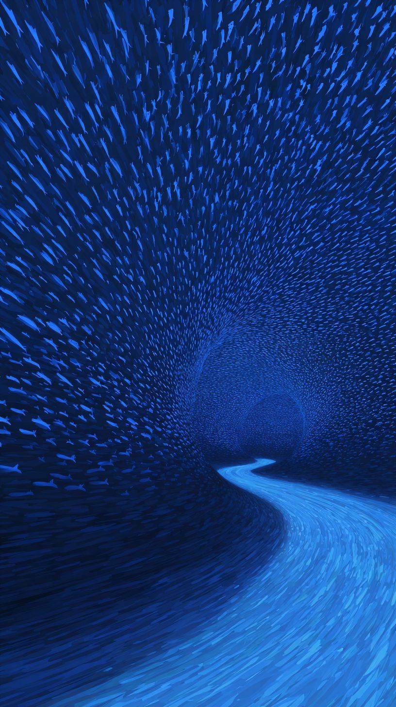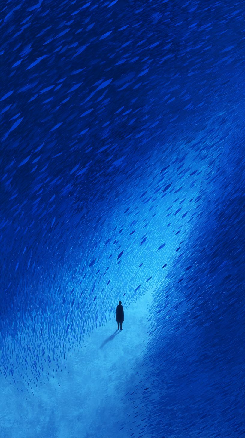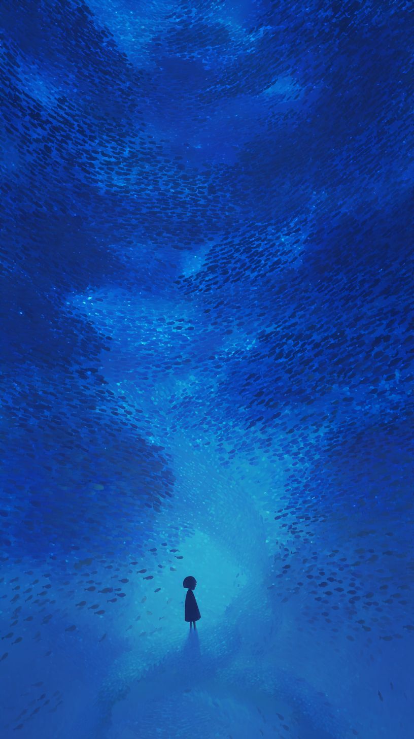 micro sobas,waving lines,A really tiny person jumping, deep blue and fish-shaped universe ocean tunnel, with many klein blue fish,and blue in the distance, in the style of Tatsuro Kiuchi. no people,This fantasy picture features a high-resolution, highly detailed, hyperrealistic, surreal, and dreamy scene. --ar 9:16 --raw --profile 57e8bjg --v 7.0