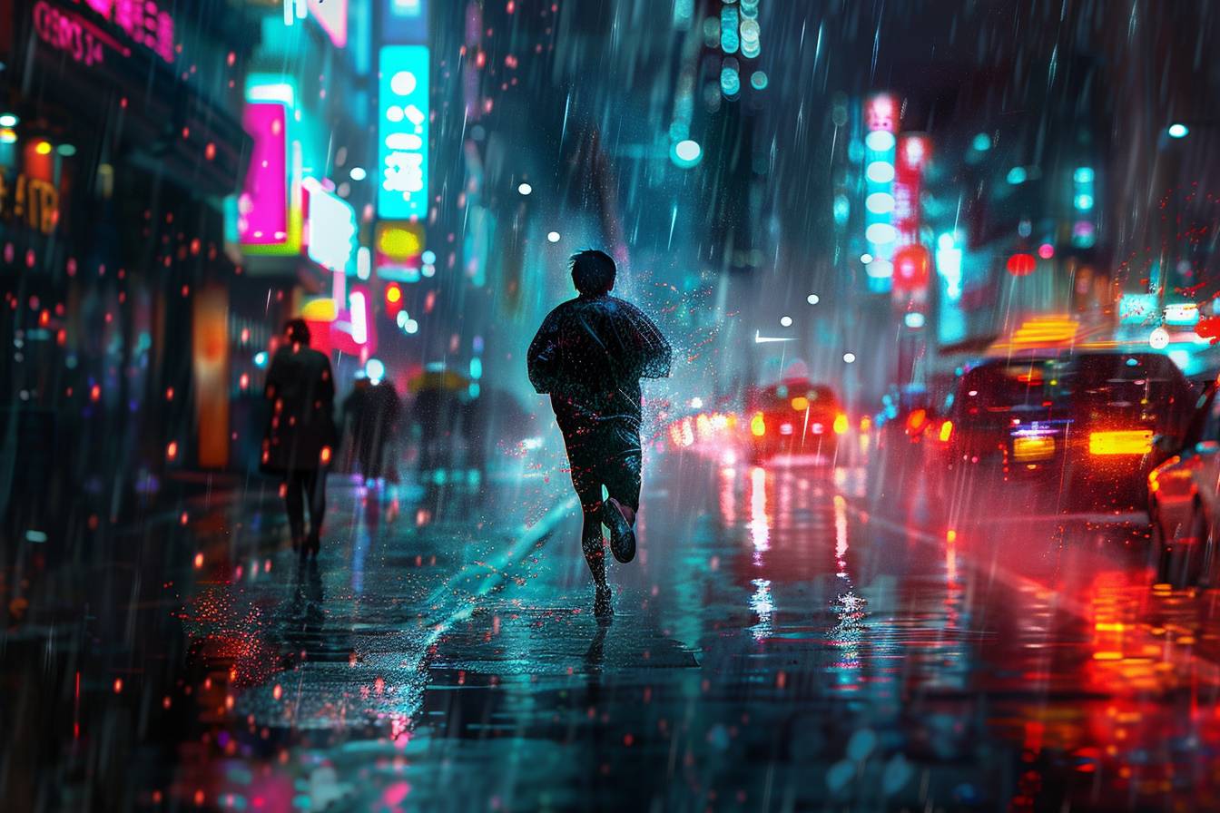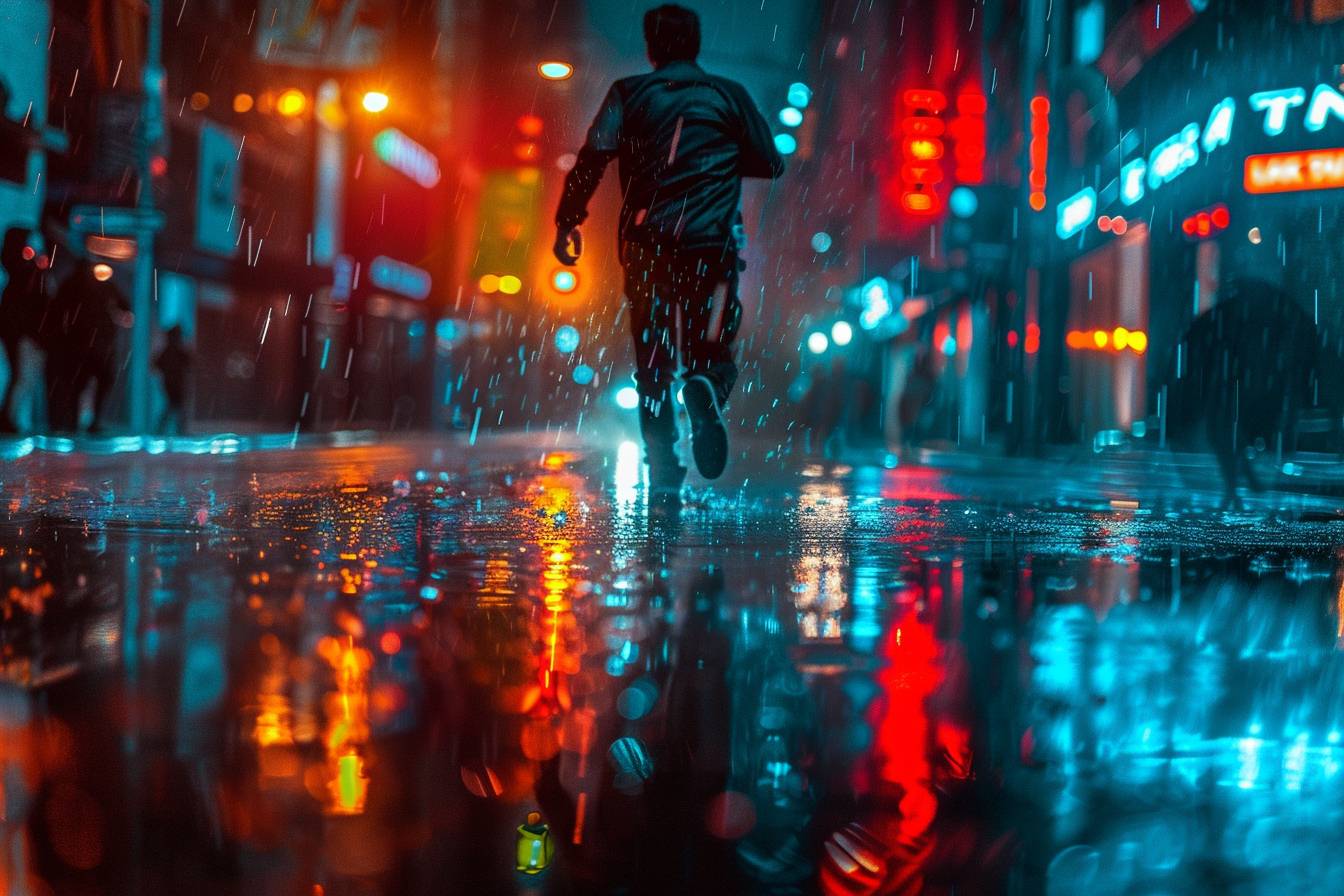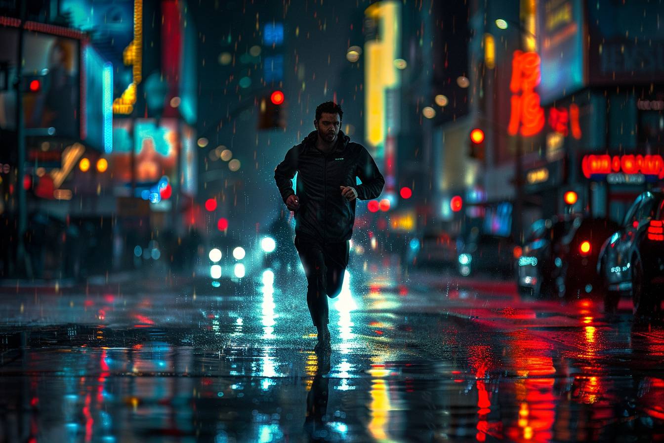 Ein Mann, der in einer regennassen Stadtstraße bei Nacht läuft, beleuchtet von Neonlichtern, die sich auf dem nassen Gehweg spiegeln, mit einem intensiven Ausdruck der Entschlossenheit.