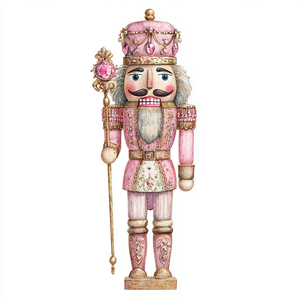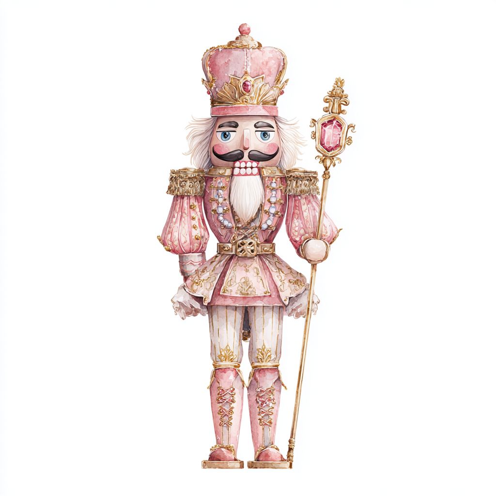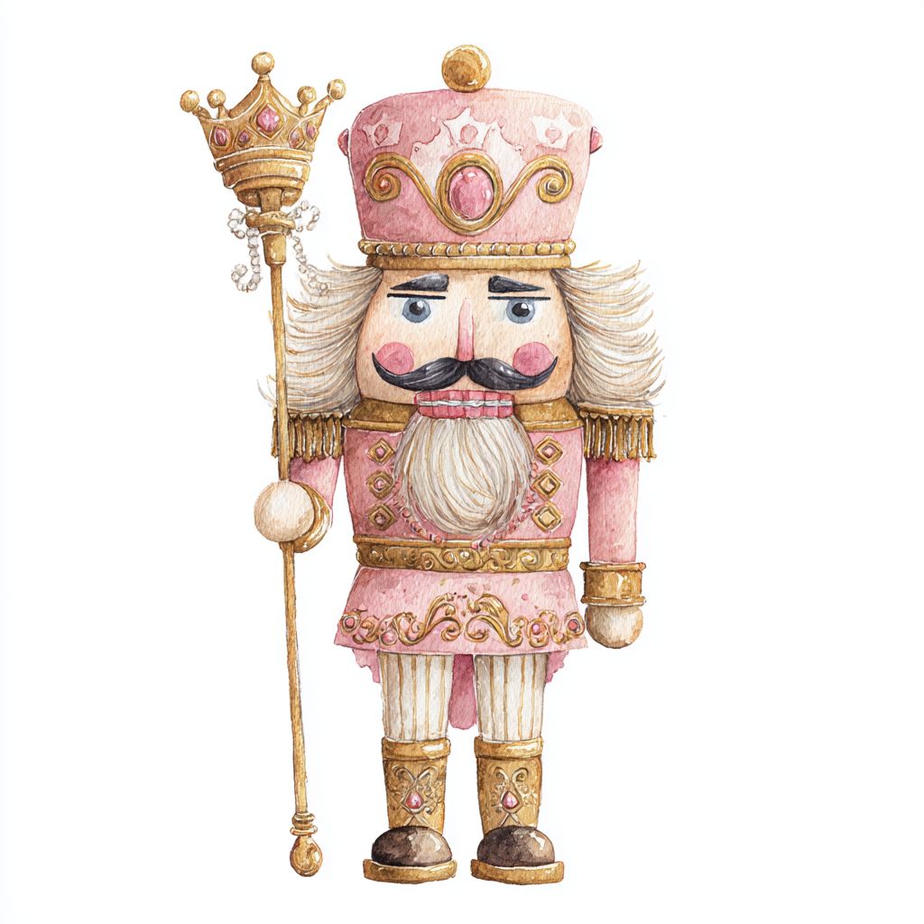 watercolor nutcracker clipart, coquette aesthetic, holding a golden scepter with pink gemstone, detailed gold embroidery and pearls, elegant watercolor wash texture, no shadows, centered isolated composition --v 7.0