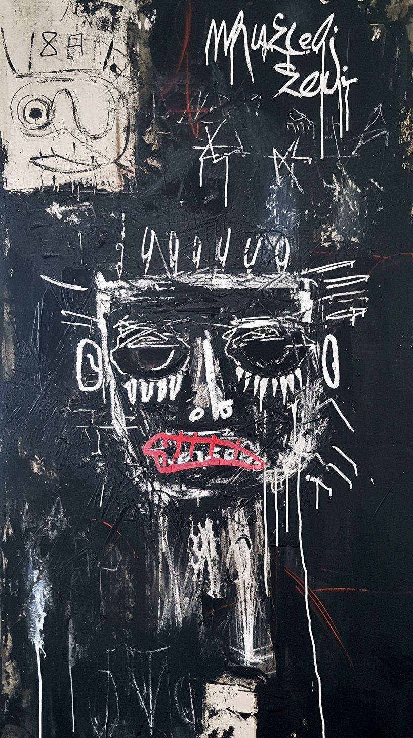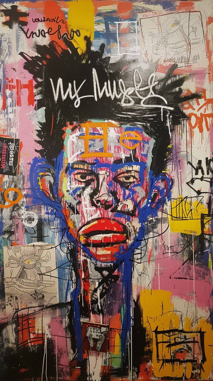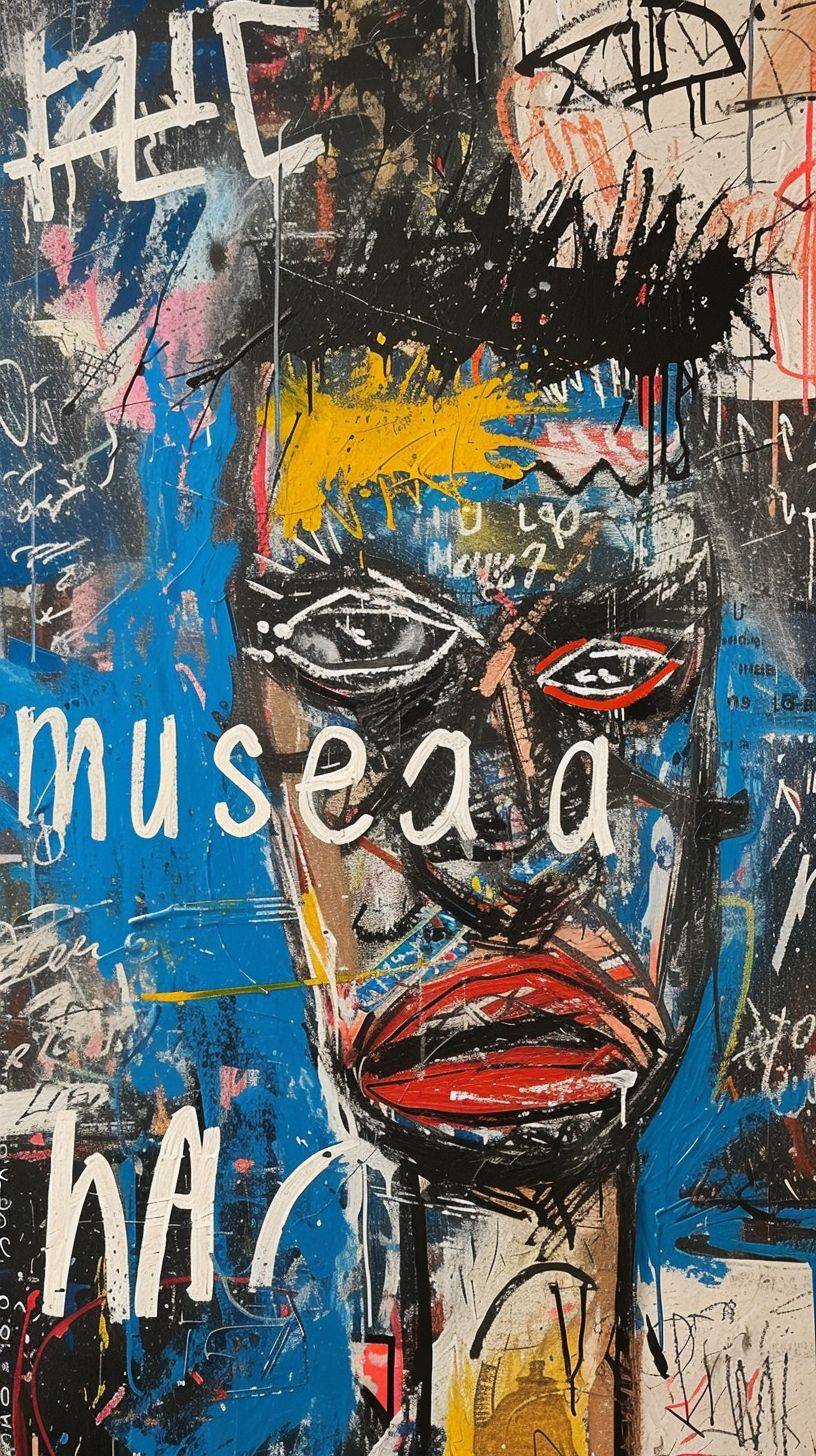 Dieses Kunstwerk zeigt Graffiti mit dem Satz 'musesai' im Stil von Basquiat und Art Brut.