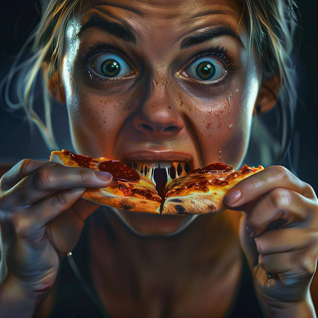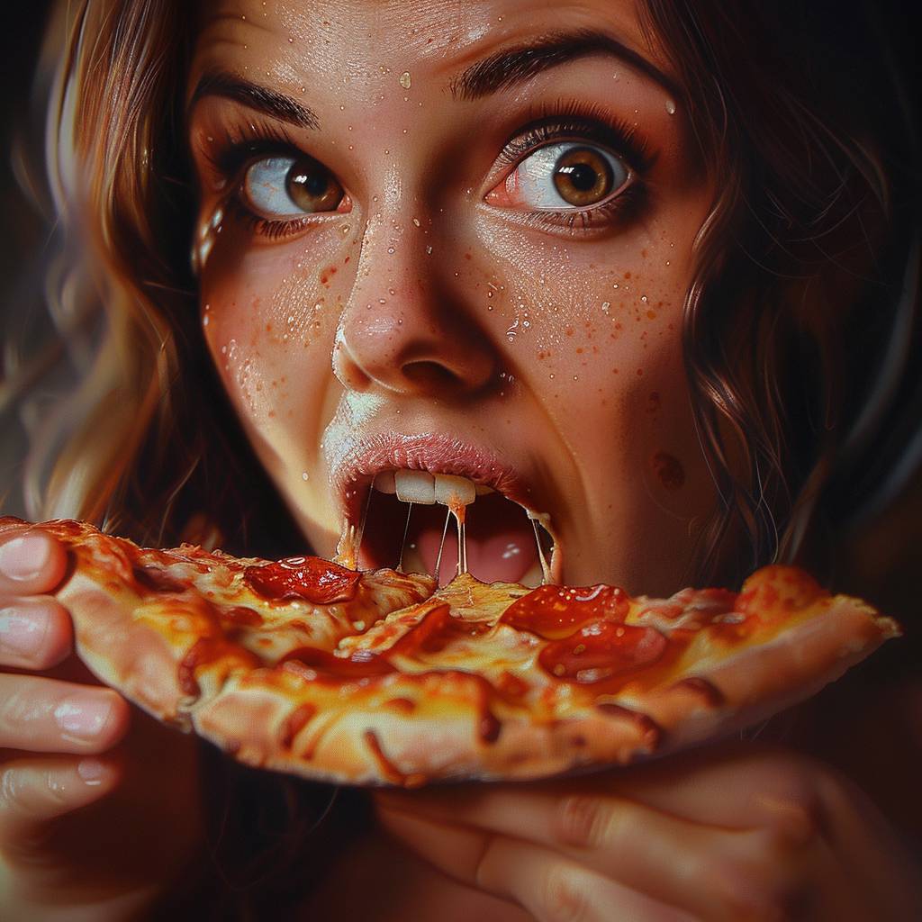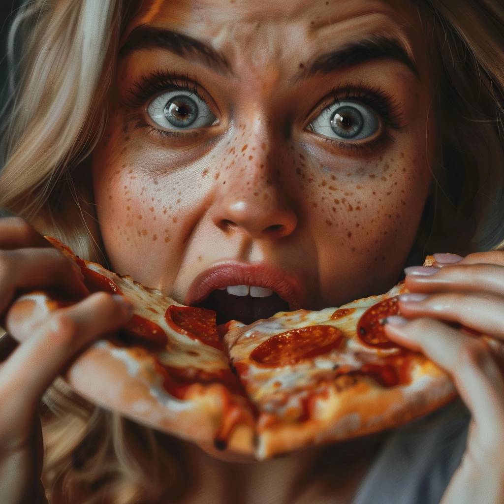 Eine Frau beißt in eine Pizza, ihr erstauntes Gesicht mit weit geöffneten Augen zeigt Aufregung und Glück, dargestellt im Fotorealismus.