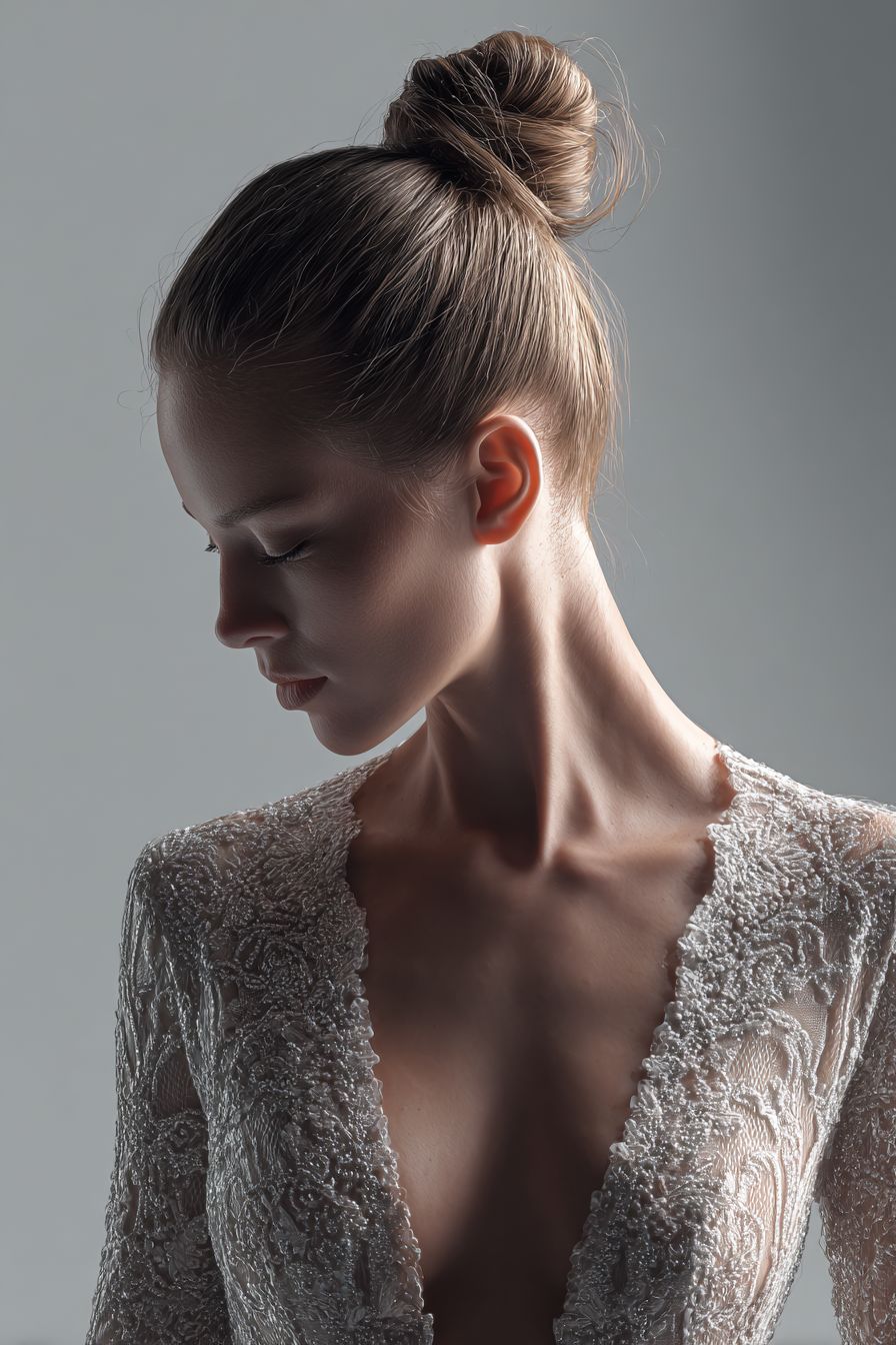 Ultra-detailliertes, fotorealistisches Porträt einer schönen Frau, High-Fashion-Editorial, tiefes weißes V-Ausschnitt Spitzenpailletten-Abendkleid, elegantes tiefes Dutt-Hochsteckfrisur, sanfte Studio-Beleuchtung, hellgrauer Hintergrund, dramatisches Schattenspiel, hyperrealistisch, 8K